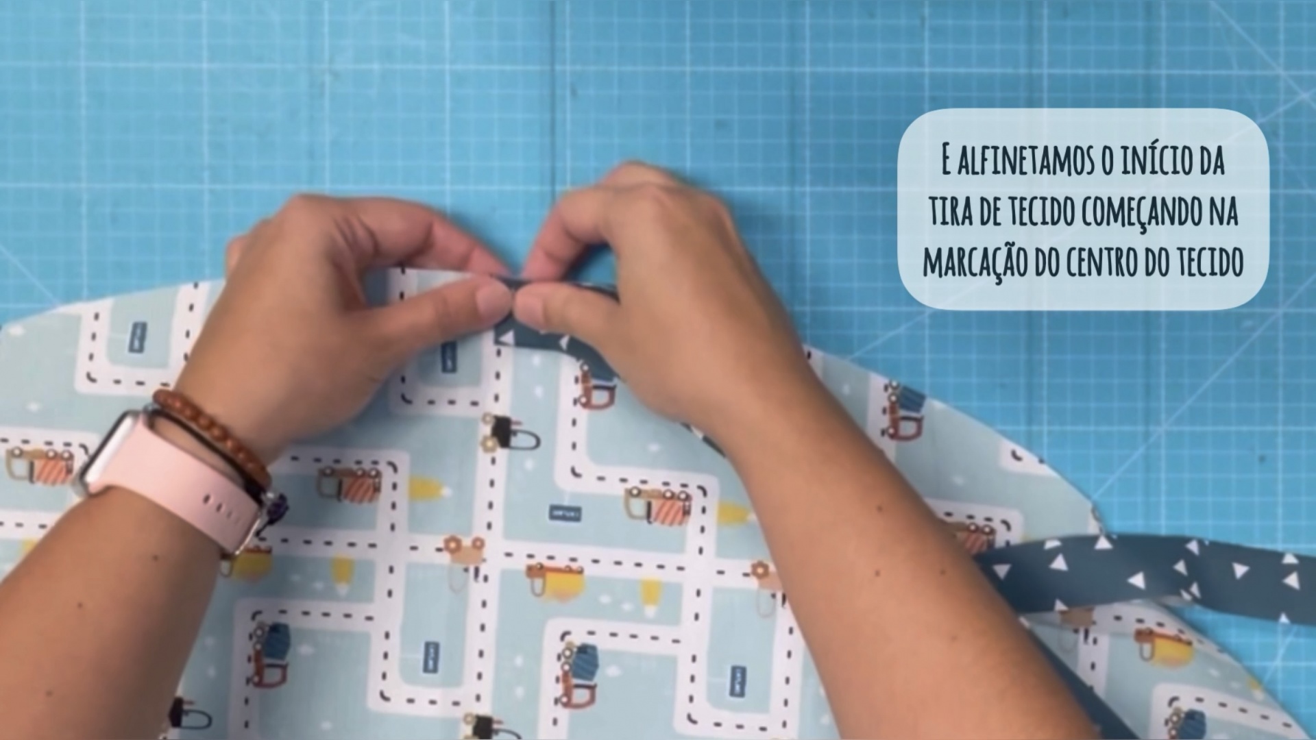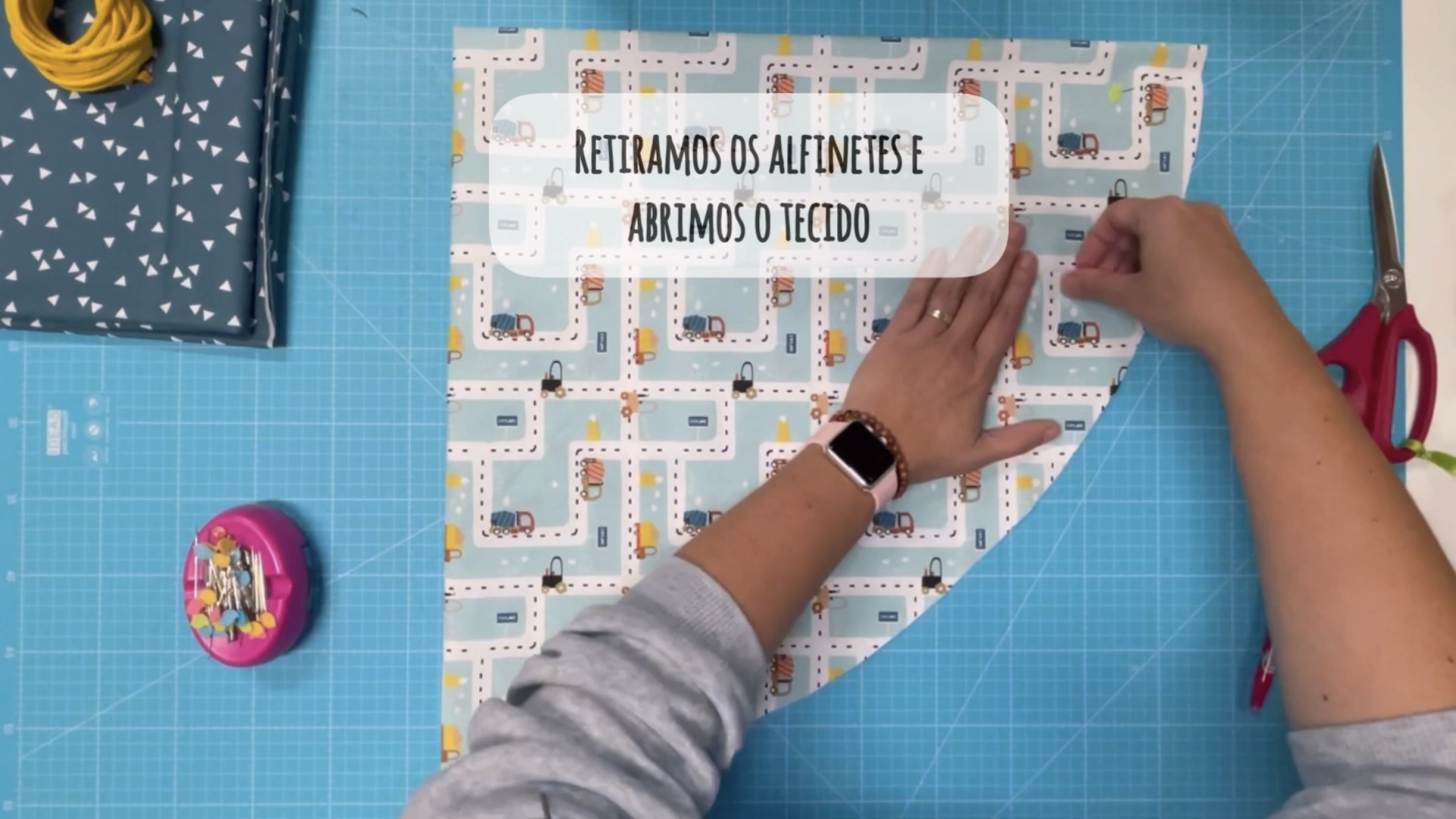 Depois de termos um quarto de circulo marcado vamos colocar uns alfinetes e cortar.
