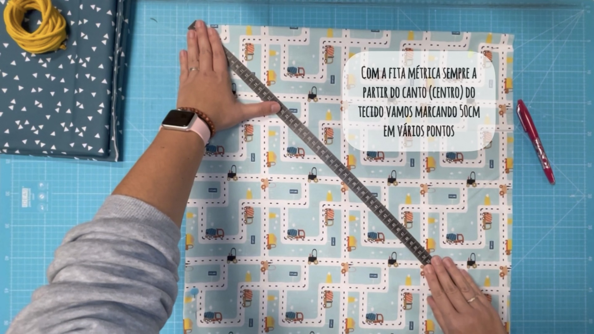 A partir do canto vamos começar a medir 50cm e vamos marcando com a caneta, vamos movendo a fita nos 50cm e marcando, mas o inicio da fita fica sempre no canto (como se fosse um compasso).