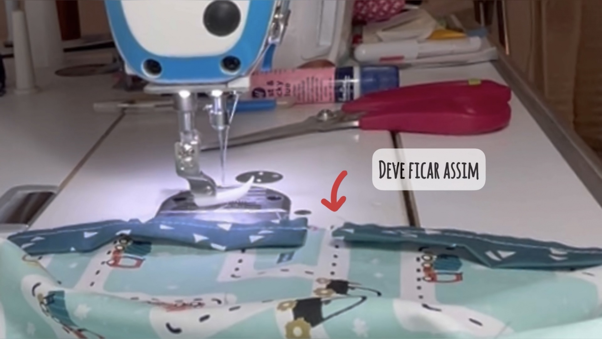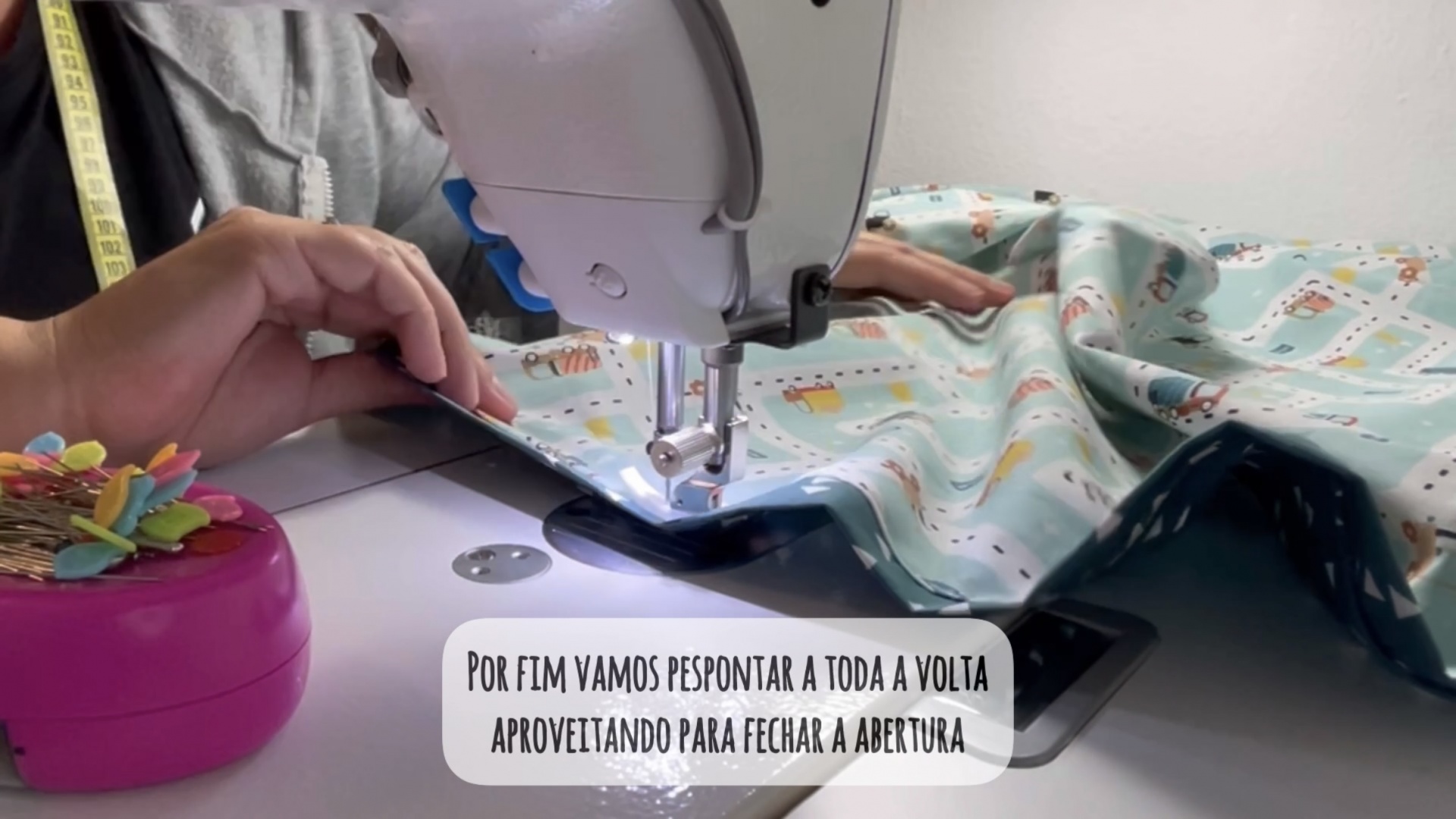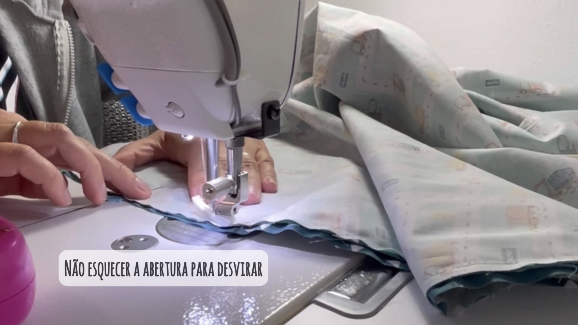 Agora vamos costurar a toda a volta deixando uma abertura para virar. Damos uma margem de cerca de 1cm para assegurar que a costura anterior não fica visivel.
