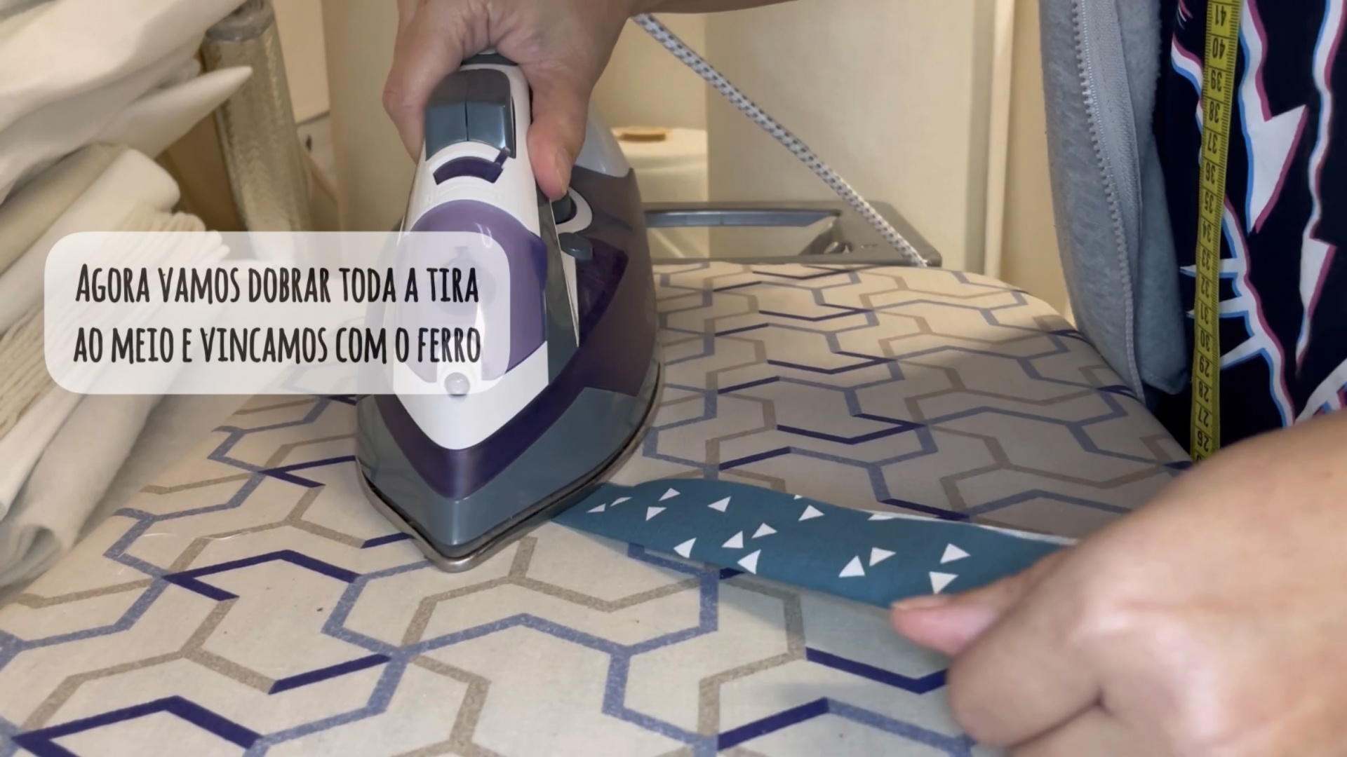 De seguida vamos passar a ferro fazendo uma dobra dupla no início, abrimos as costuras e vamos vincando ao meio sobre o comprimento.