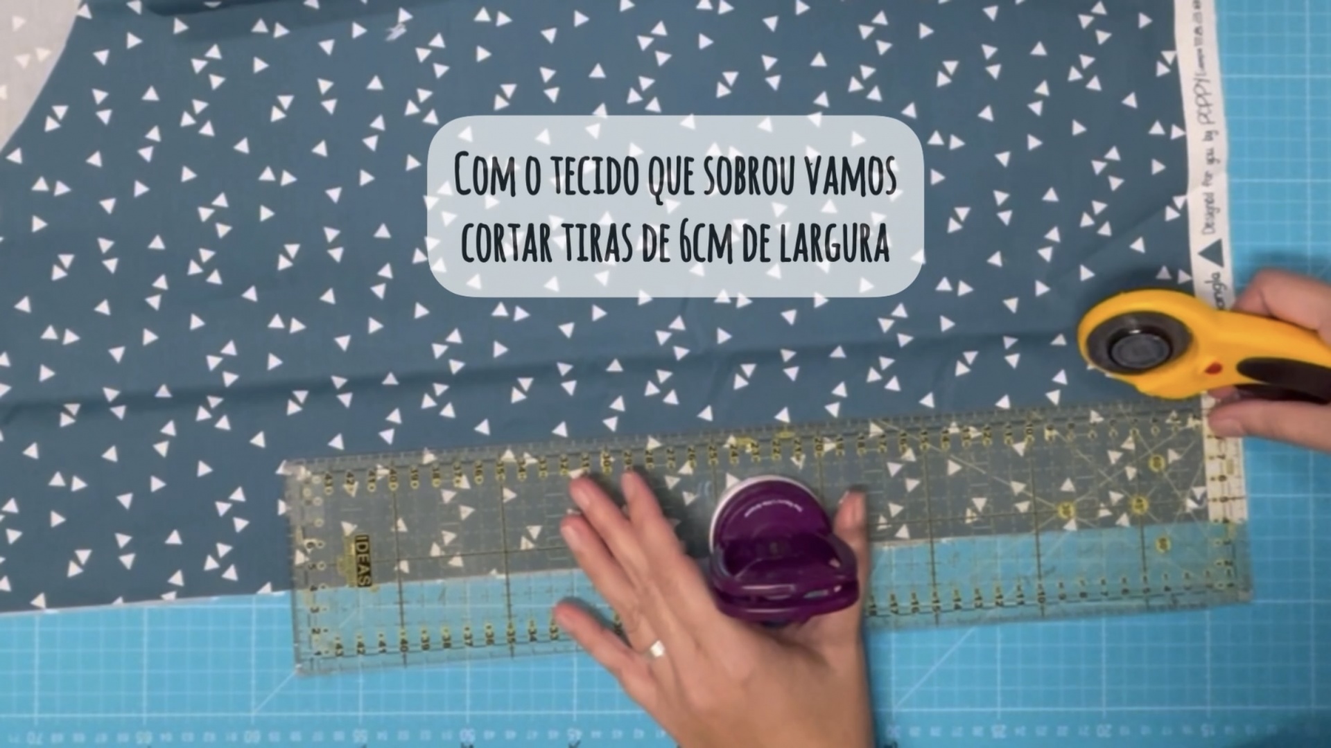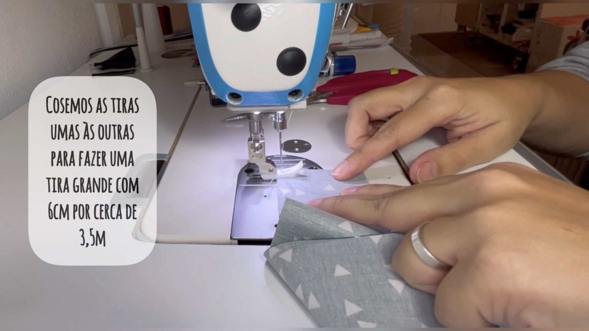 Com o tecido que sobrou vamos cortar tiras de 6cm de largura, vamos coser umas às outras porque no total vamos precisar de uma tira com mais ou menos 3,5m.