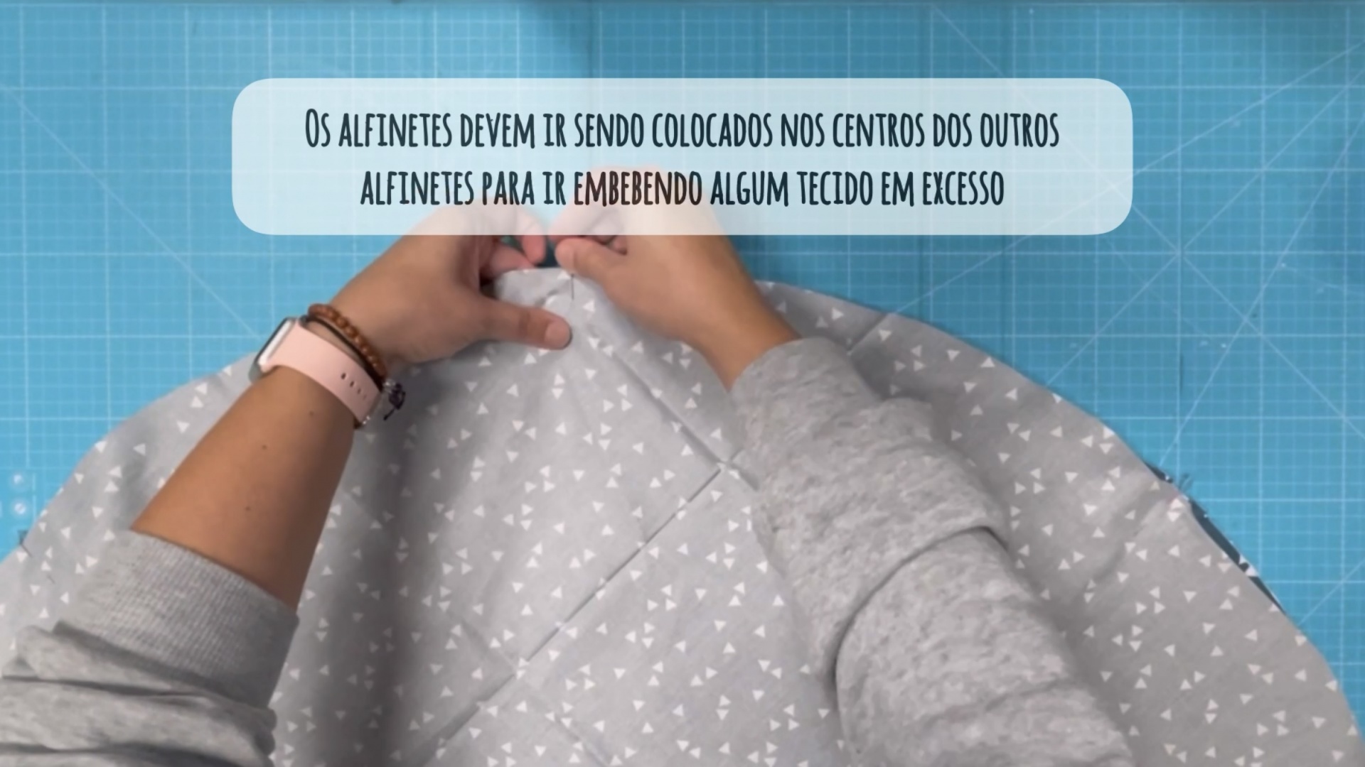Agora vamos marcar os 4 centros e alinhar os dois tecidos frente com frente, começamos por colocar alfinetes nas marcações e vamos colocando alfinetes sempre ao centro dos anteriores, assim conseguimos embeber algum tecido de sobra.