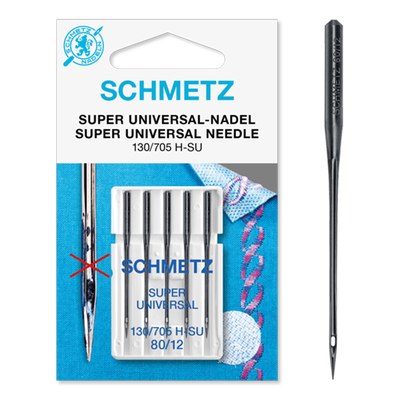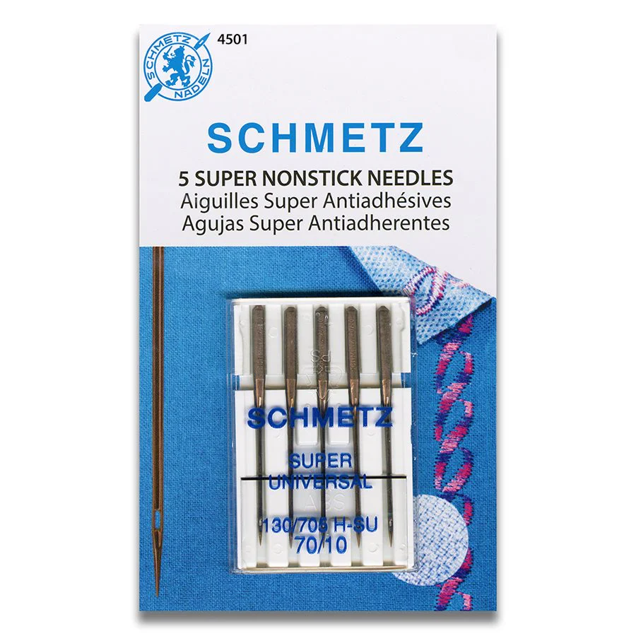 A agulha para máquina de costura SCHMETZ Super NonStick é uma agulha Super Universal com lâmina reforçada, olho extra largo, chanfro profundo e ponta levemente arredondada. O revestimento antiaderente (NIT) resiste a estabilizadores, entretelas e adesivos pegajosos. Após o uso pode ser necessário limpar os residuos em excesso.