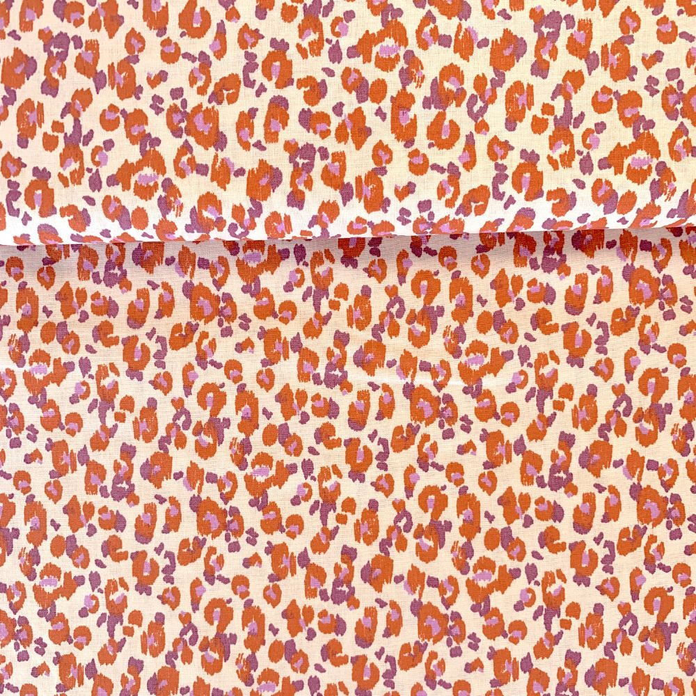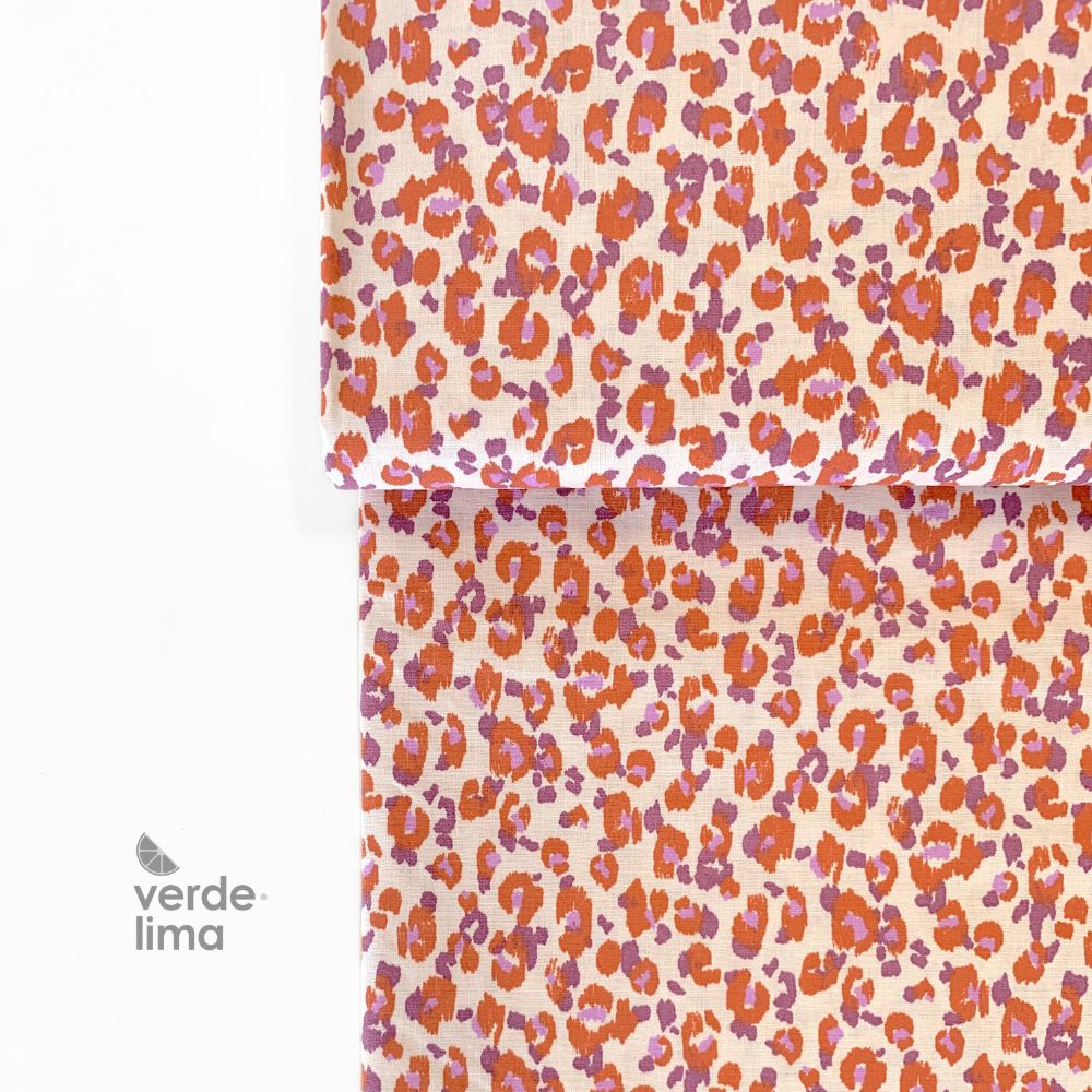 Estampado de animal print em tons vibrantes (laranja, roxo e lilás) num fundo creme.