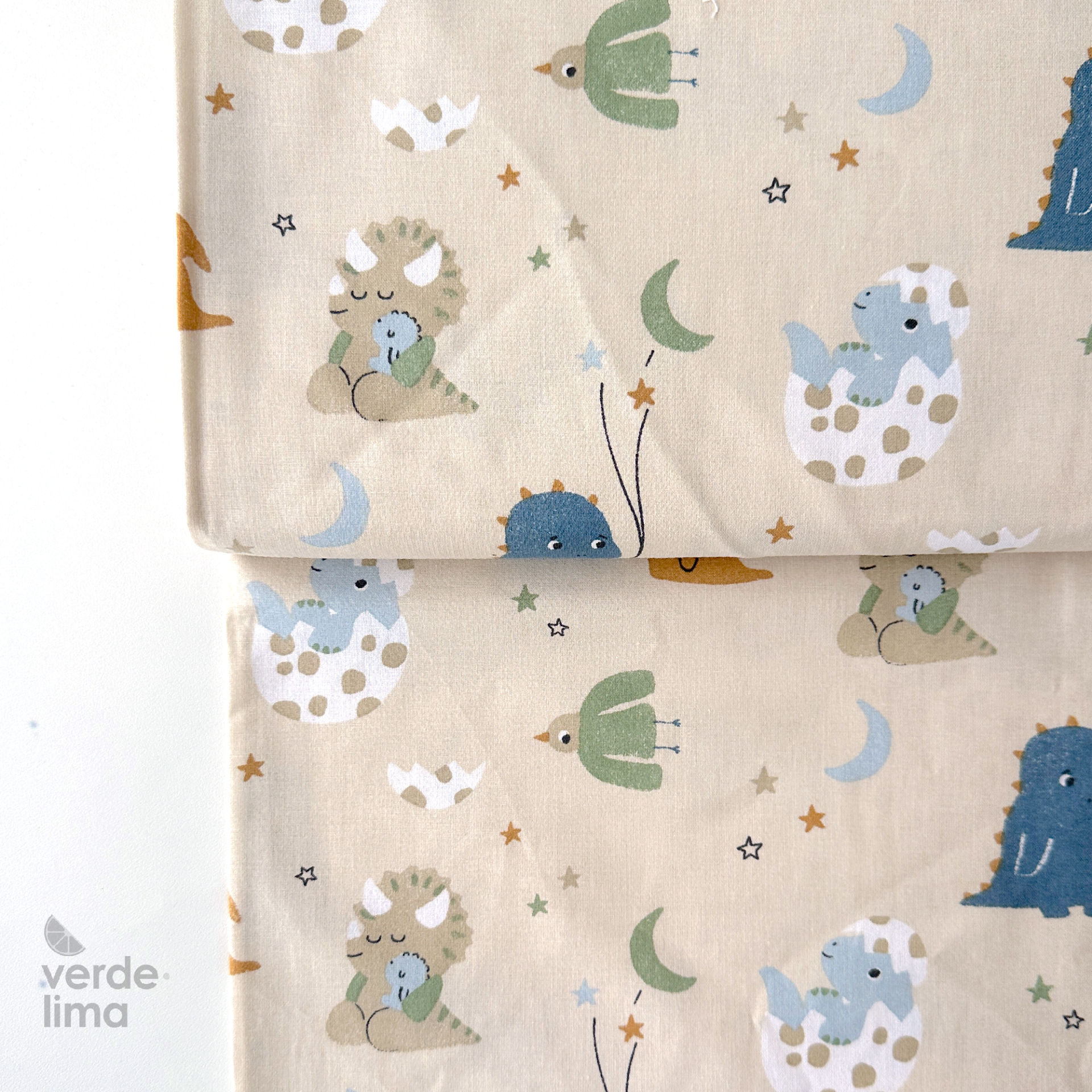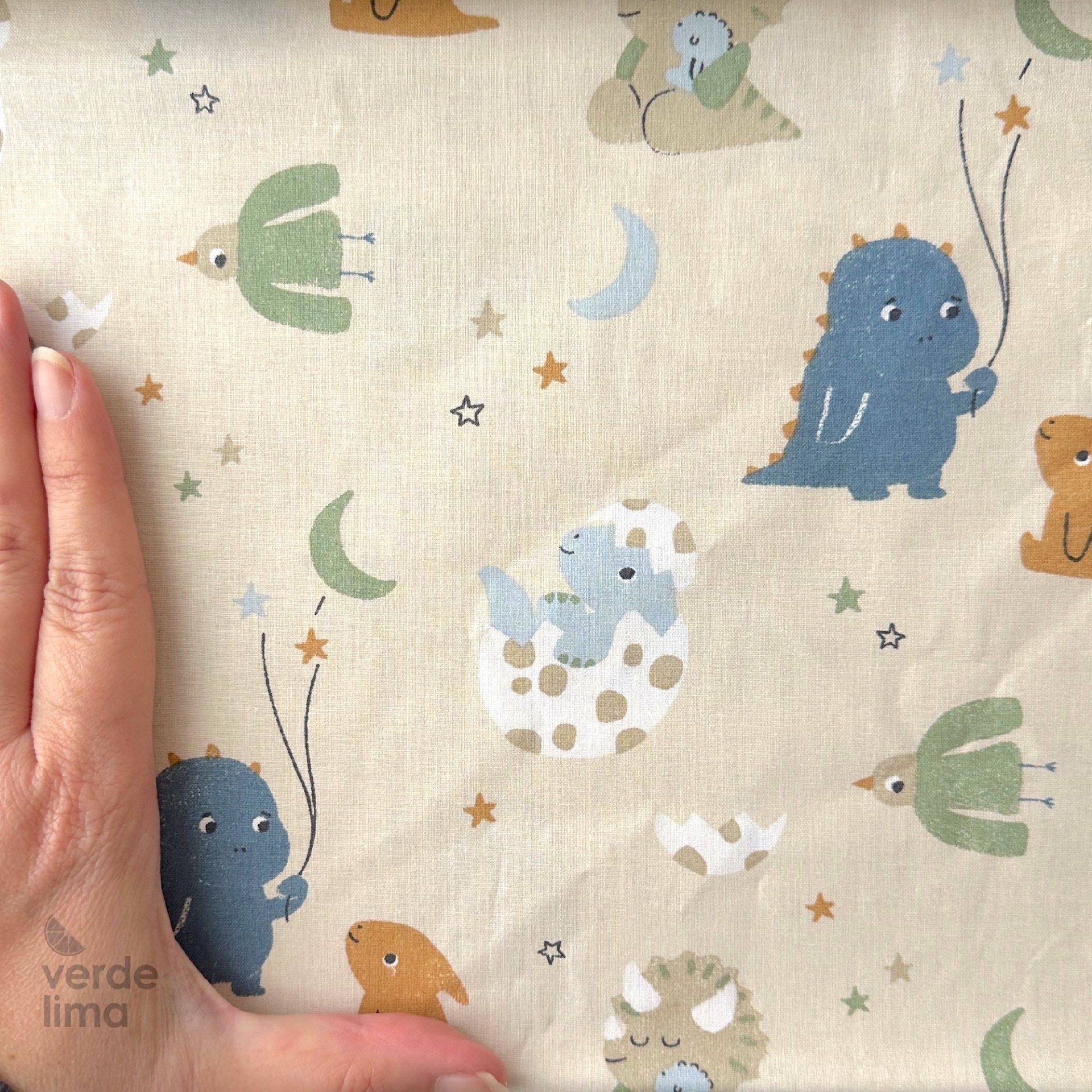 Estampado com dinossauros bebés, estrelas, luas e pássaros em fundo bege.