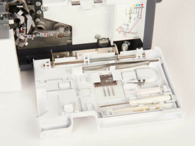 Os acessórios de costura mais importantes estarão sempre à mão na tampa de proteção dos crochets. os restantes acessórios são armazenados numa caixa em separado.
