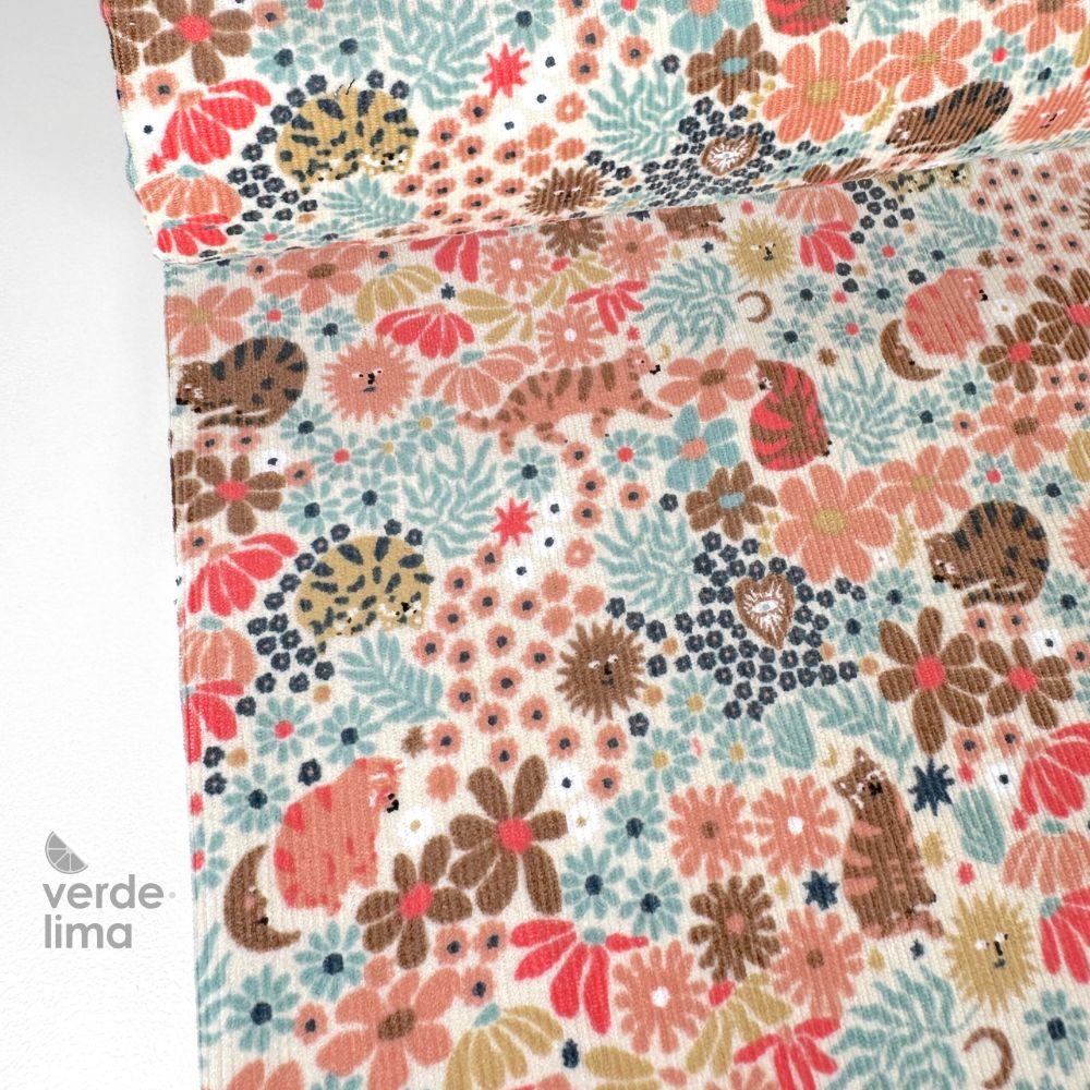 Bombazine com risca fininha estampada com flores, animais e luas num fundo creme.