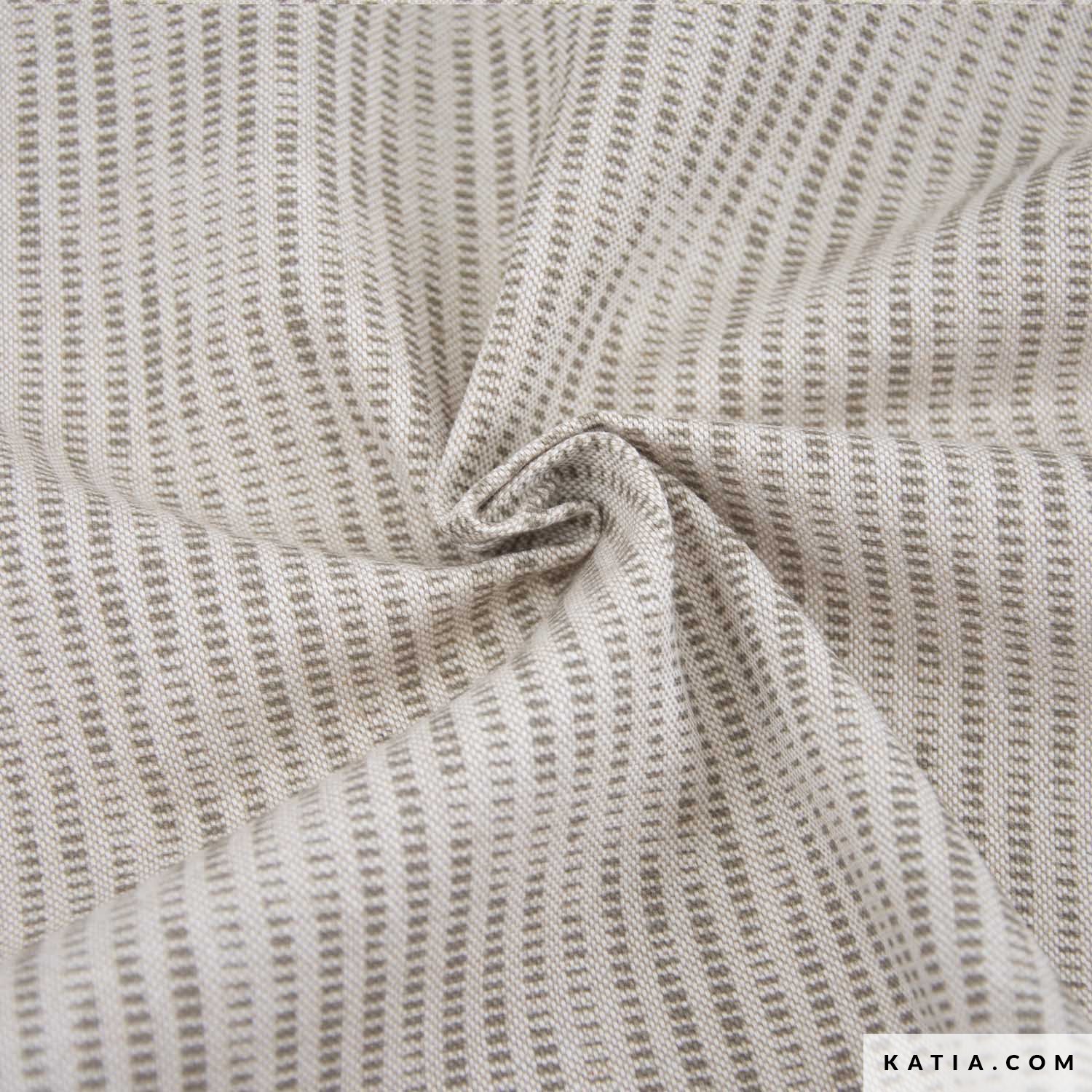 Tecido Canvas reciclado, rústica, macia e resistente com uma estampa de listras sobre fundo cru.