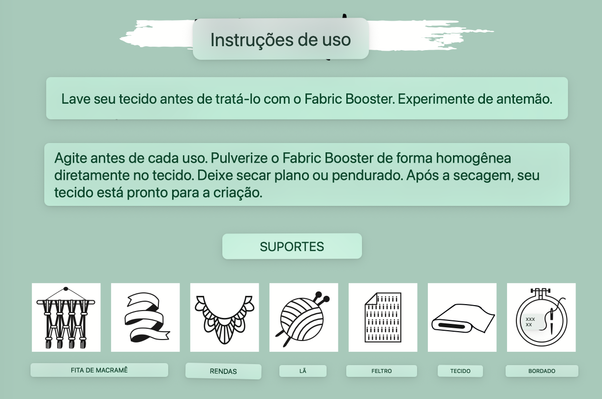 Agitar bem antes de cada utilização. Vaporizar o fabric booster directamente no tecido a uma distância de aproximadamente 25cm. Espalhar o produto uniformemente e retirar o excesso. Deixar secar ao ar livre cerca de 30 minutos.