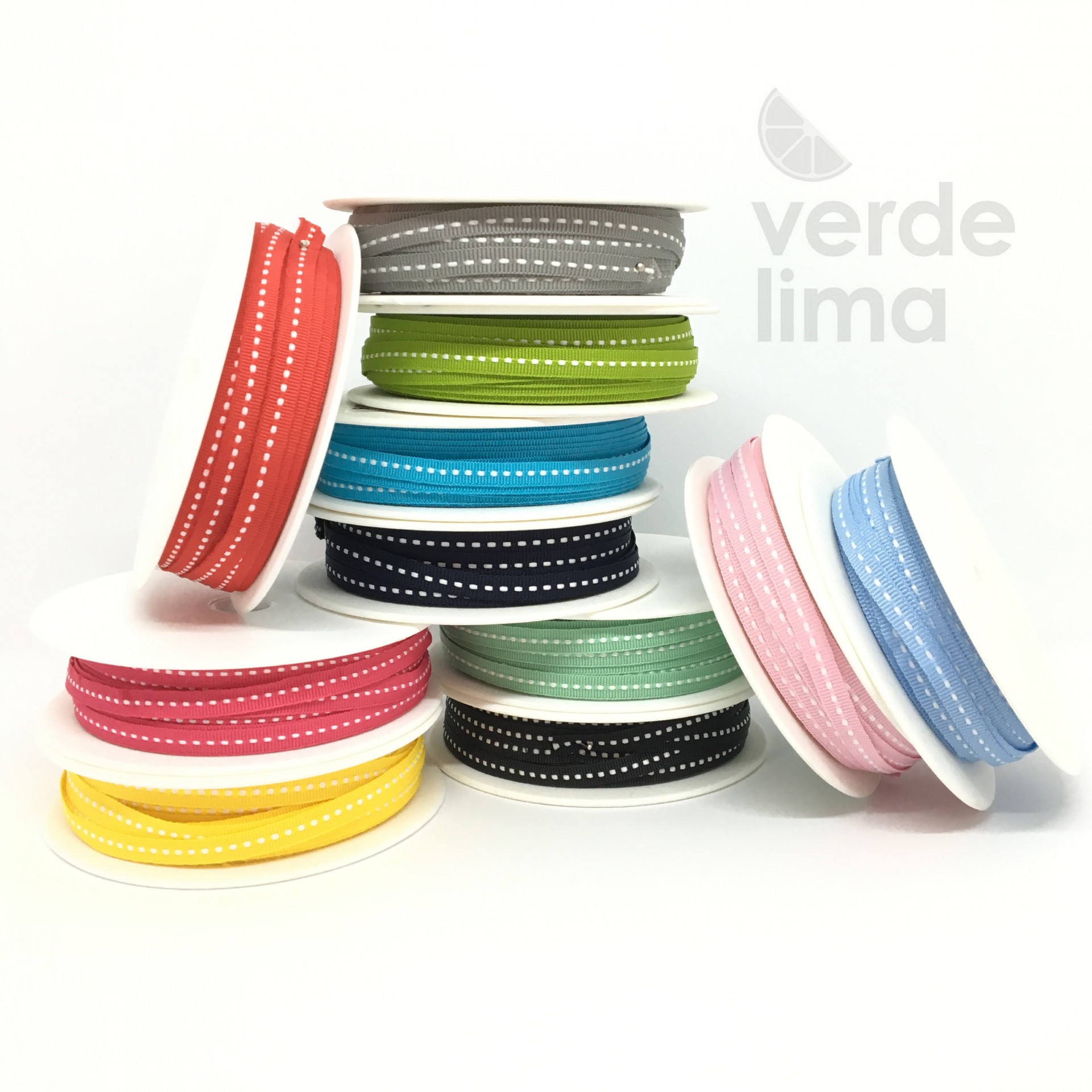 Fita de gorgurão com 4mm de largura e efeito de pesponto a branco.