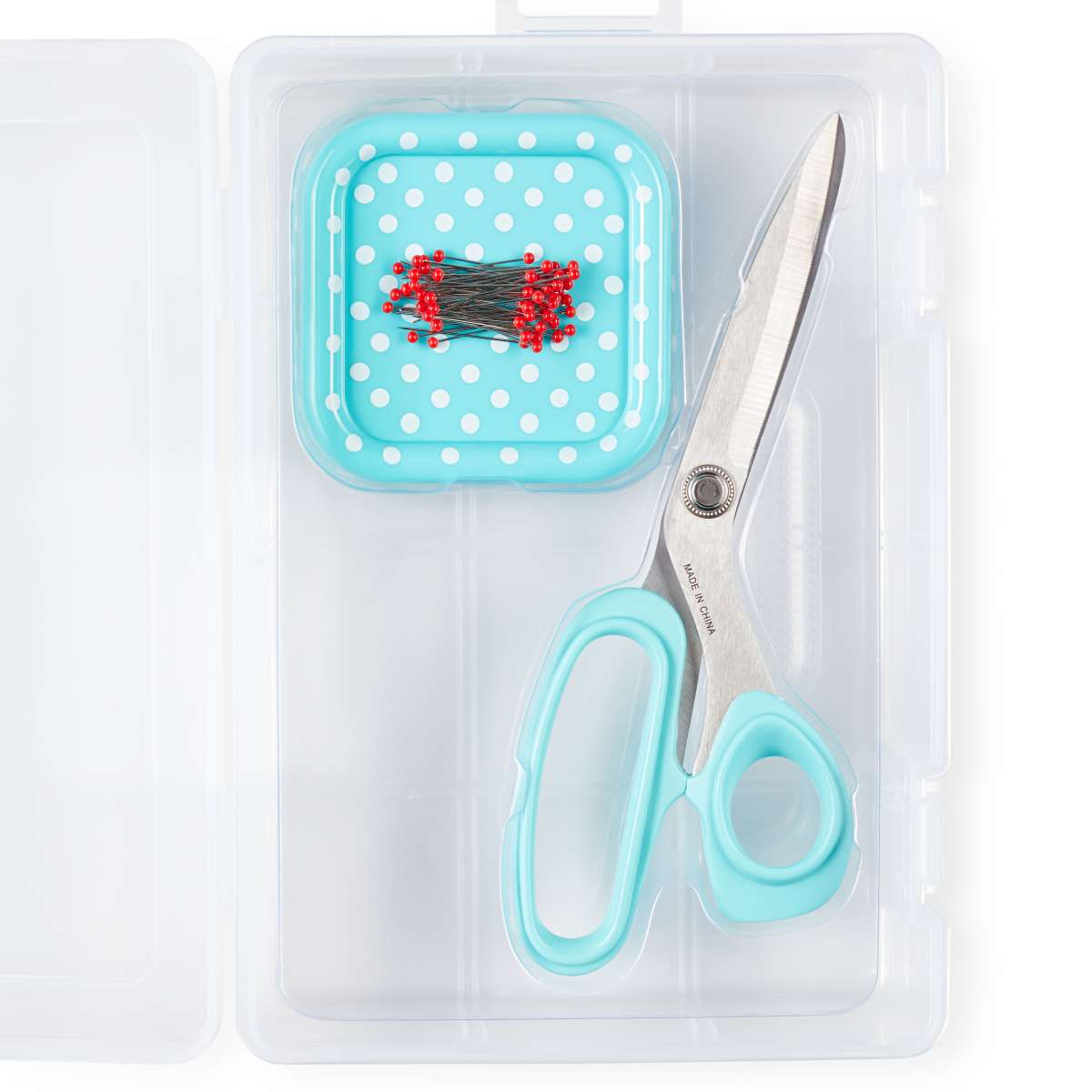 Inclui: Uma caixa com dois níveis para ficar tudo arrumado, tesoura, caixa de agulhas, alfineteiro magnético com alfinetes, molas mágicas, lápis branco, régua, descosedor e uma mini almofada de alfinetes.