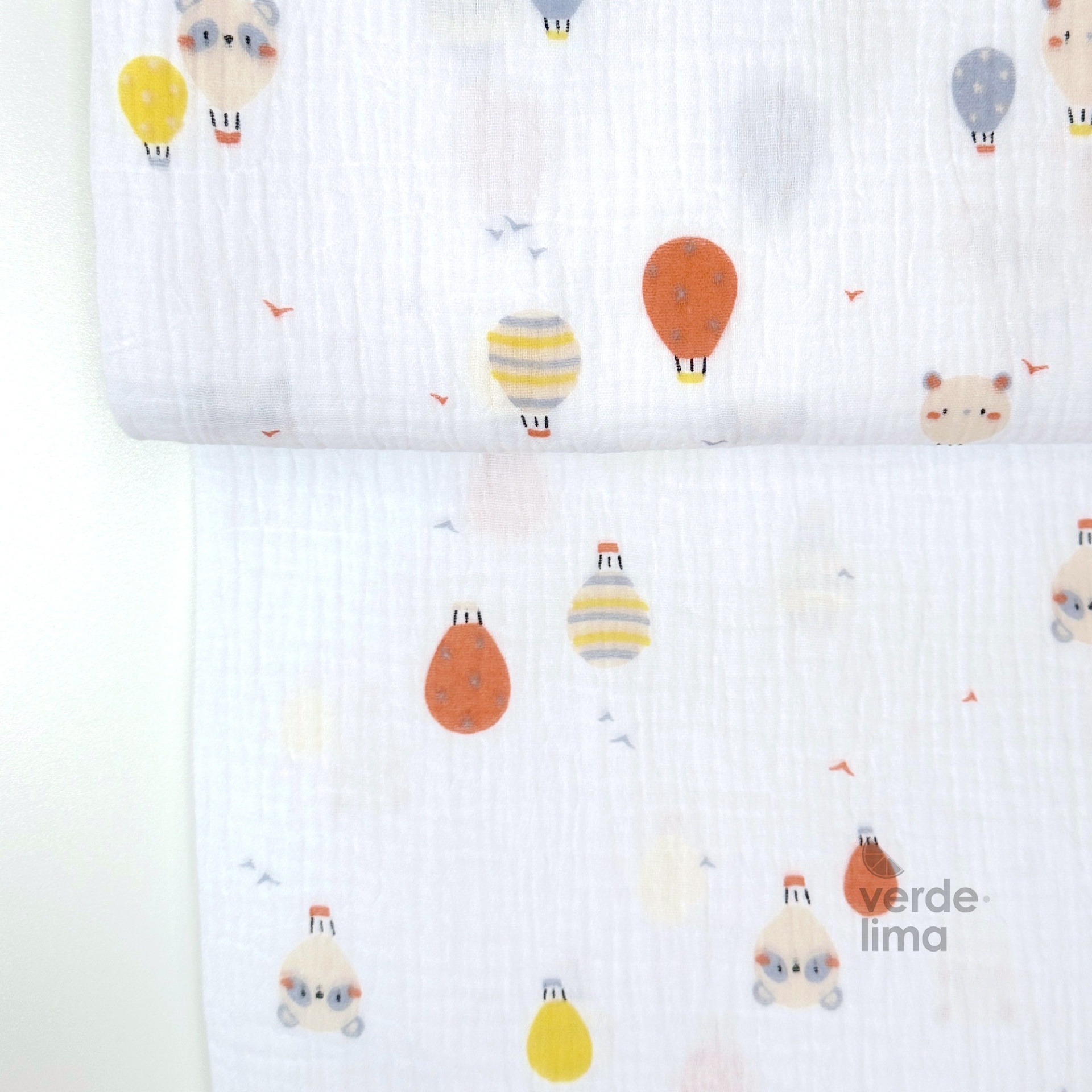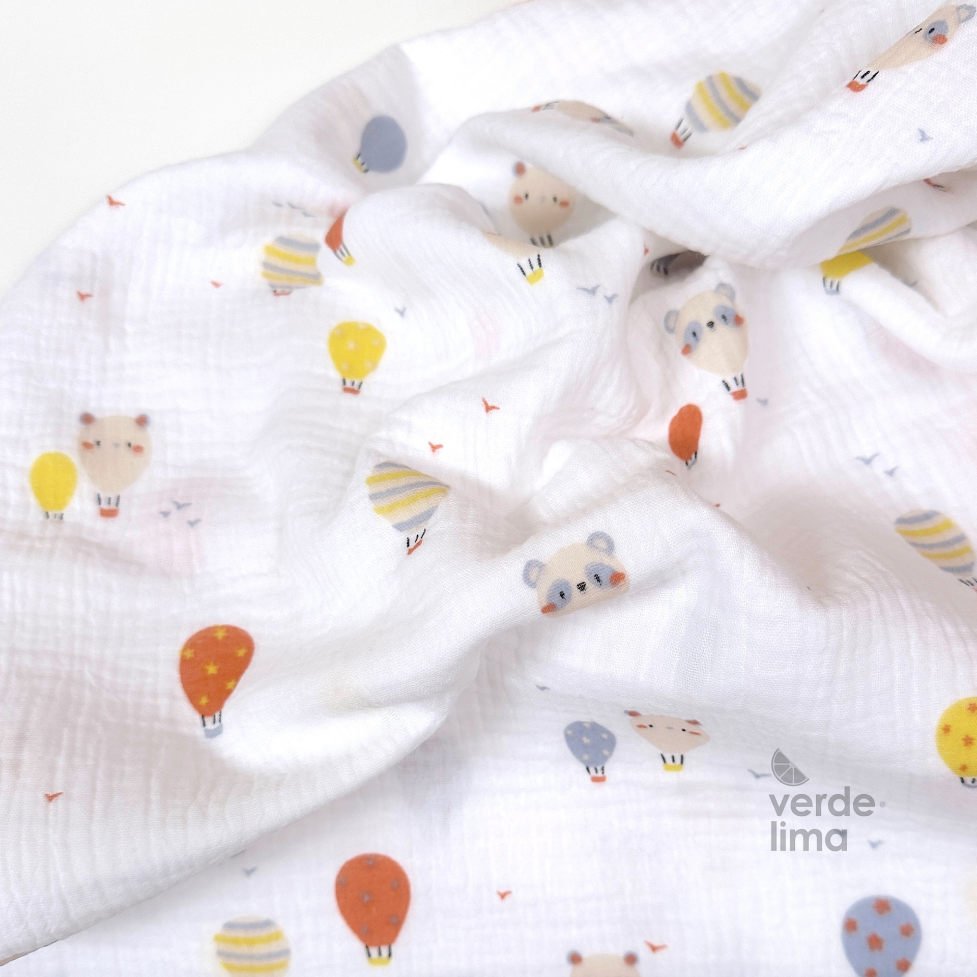 Musselina branca com estampado de balões de ar quente com cabeças de animais.