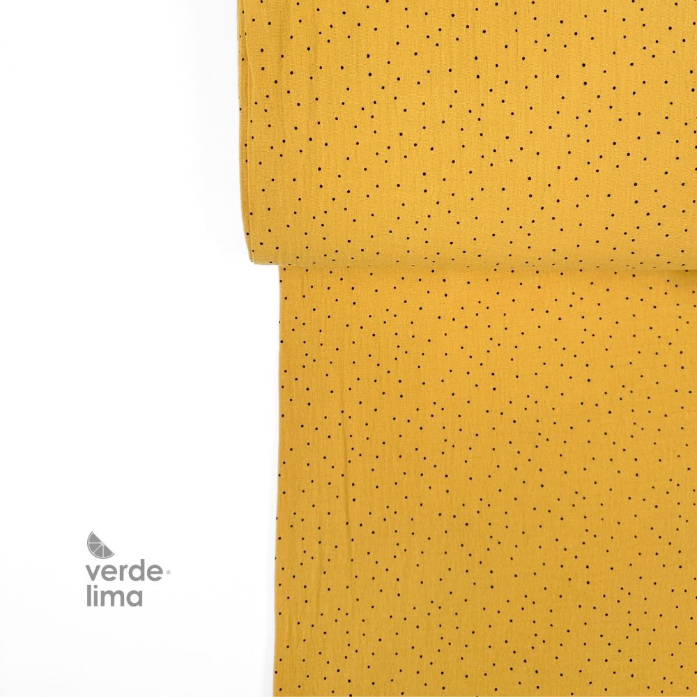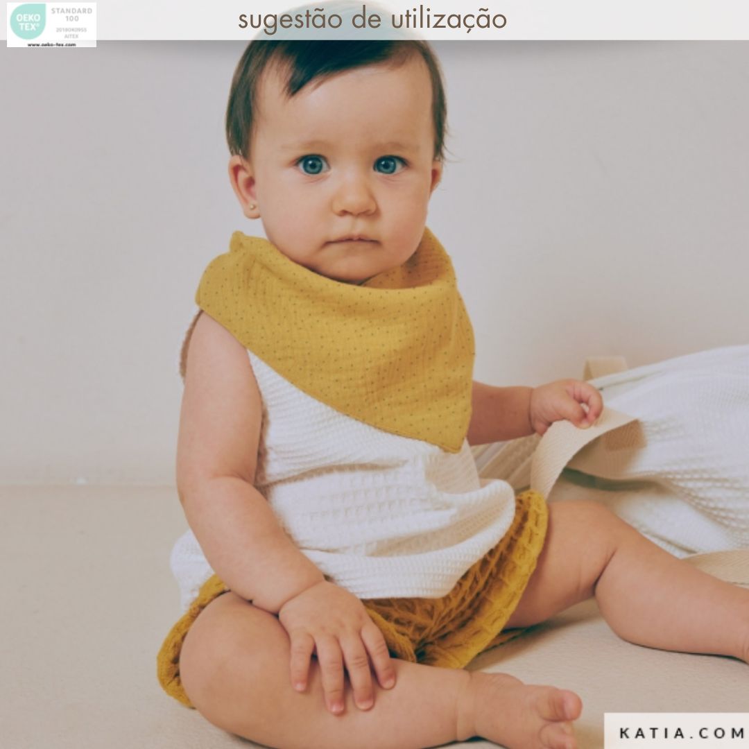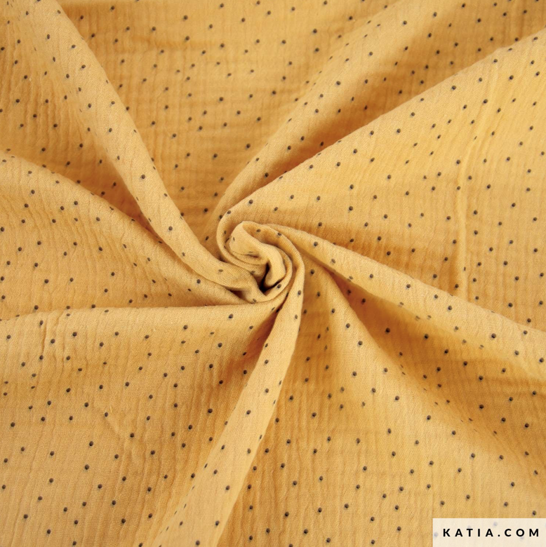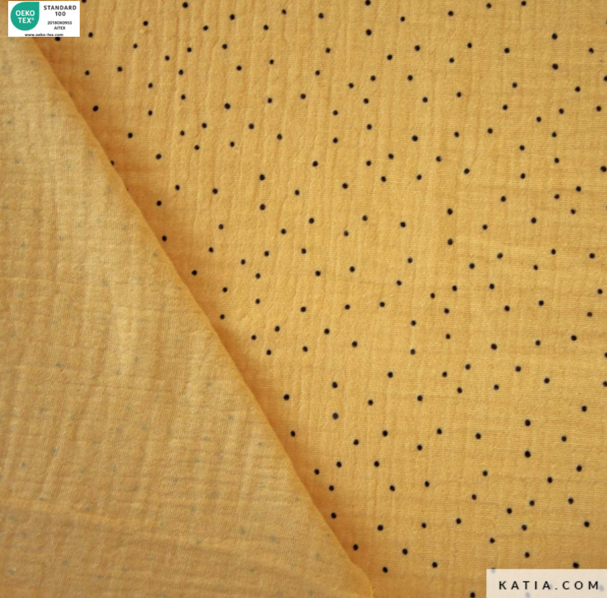 Graças à sua bela estampa de pintas sobre um fundo mostarda, a musselina Africa Dots da Katia Fabrics é perfeita para uma grande variedade de peças de vestuário e acessórios. Além disso, graças à sua suavidade, é ideal para roupas e projectos de costura para os mais pequenos da casa, como camisas, vestidos, fraldinhas ou babetes.