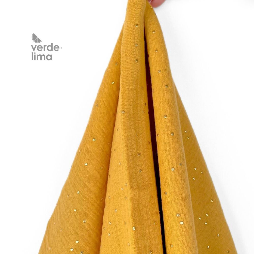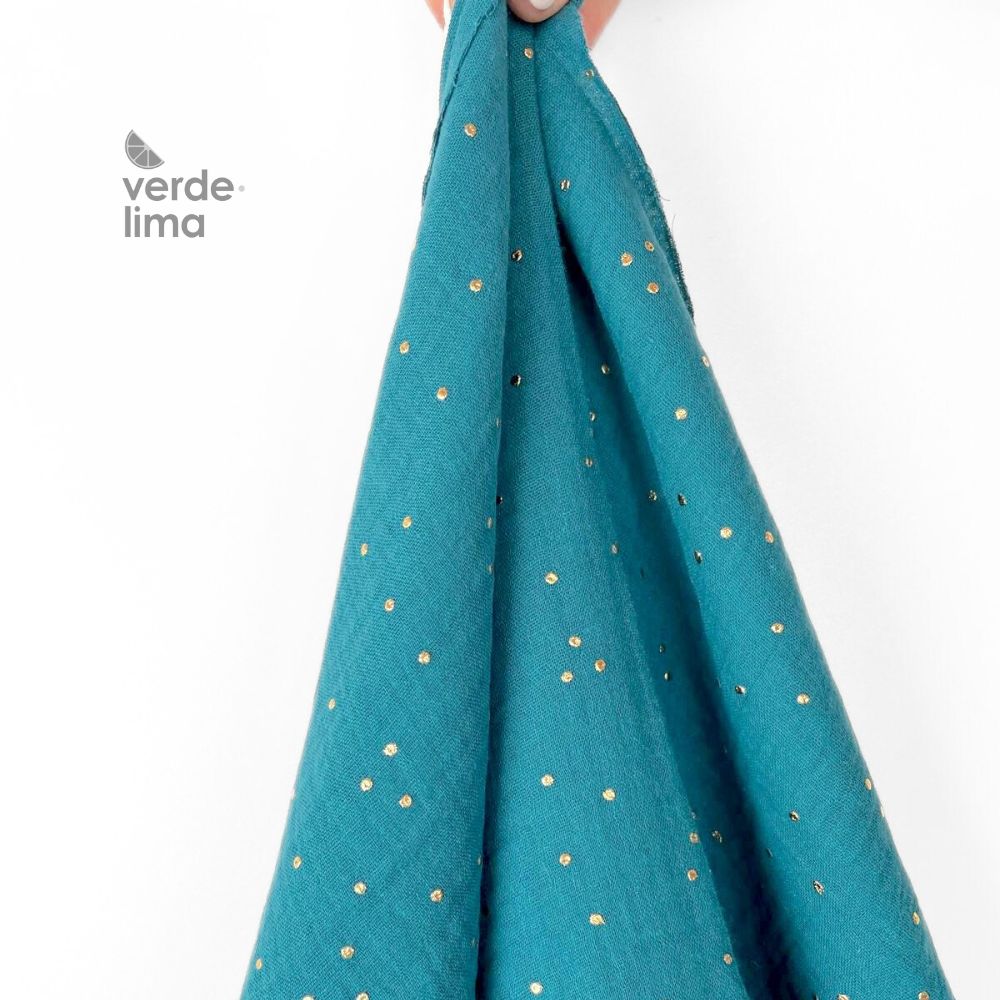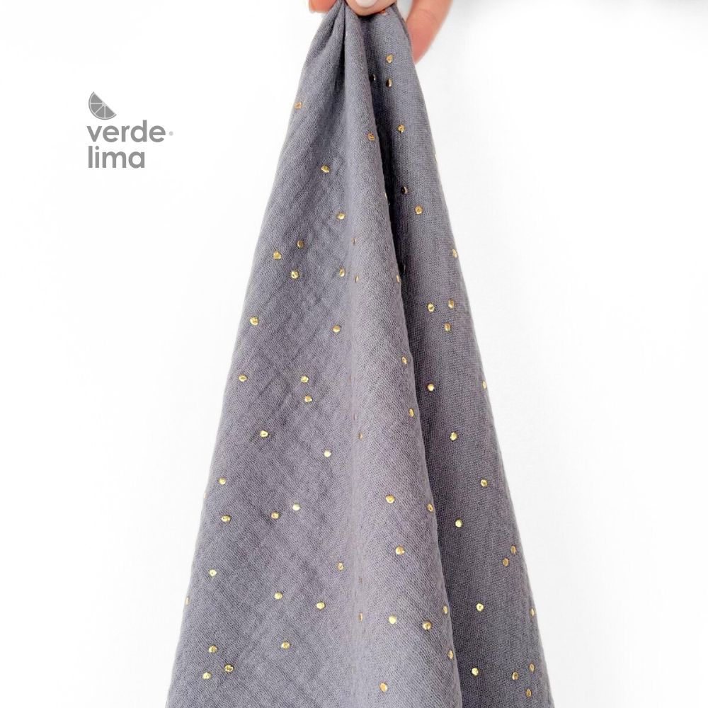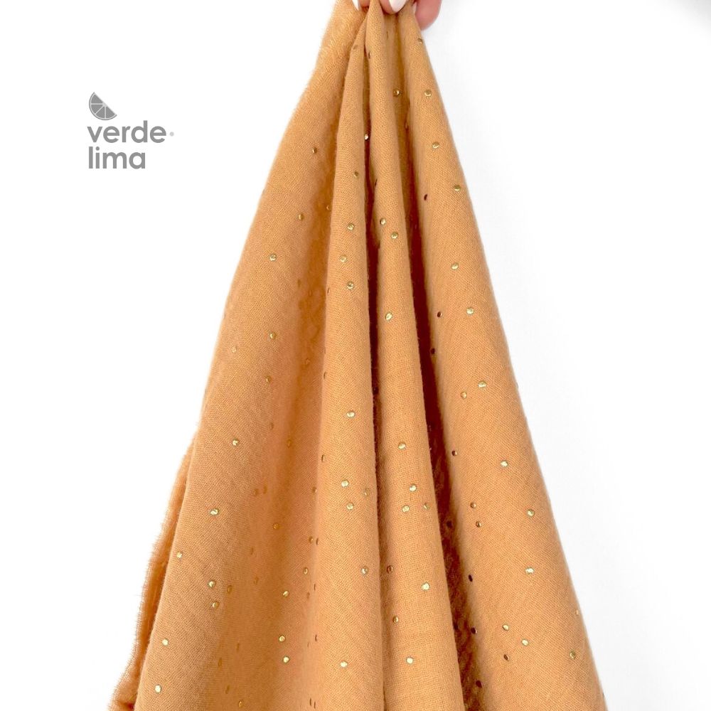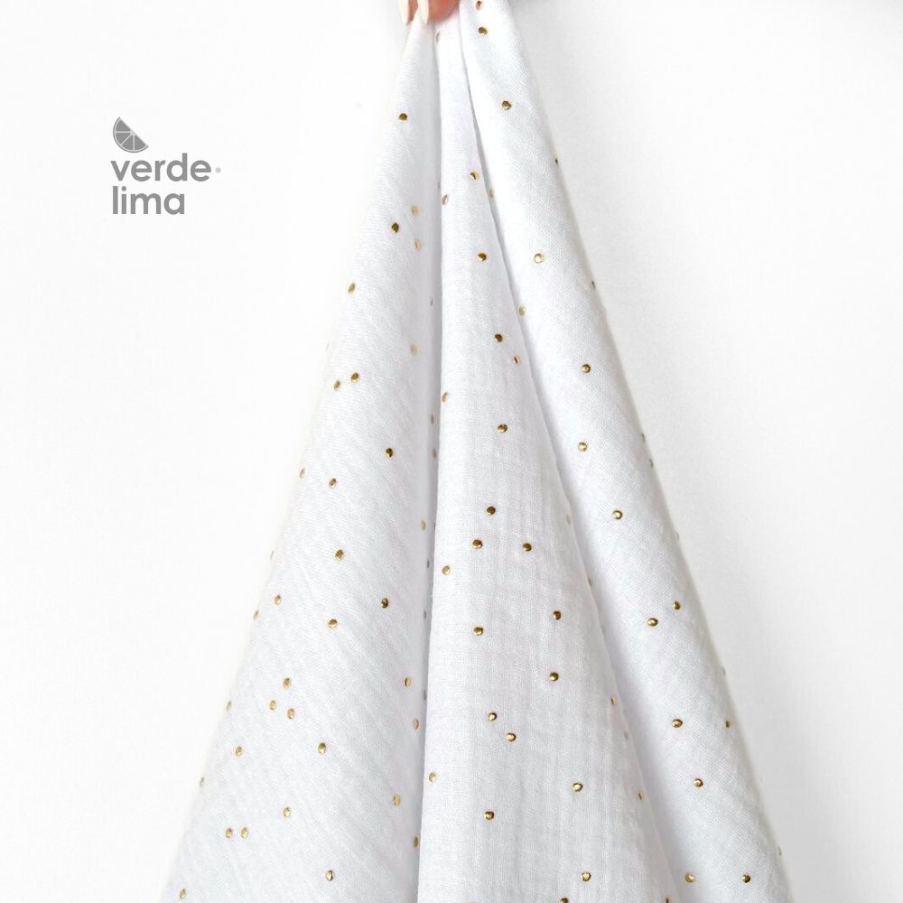 Musselina 100% algodão com pintas douradas.