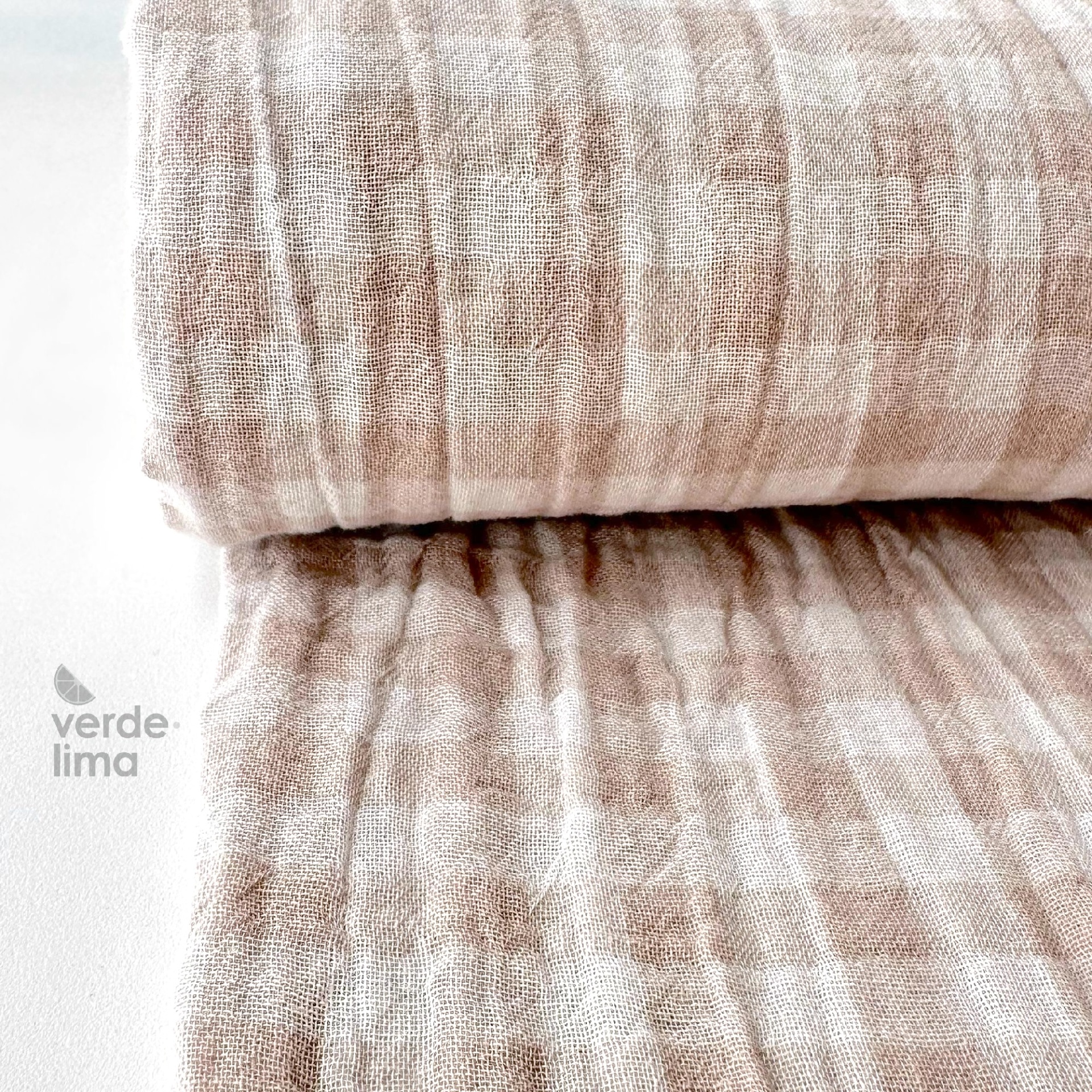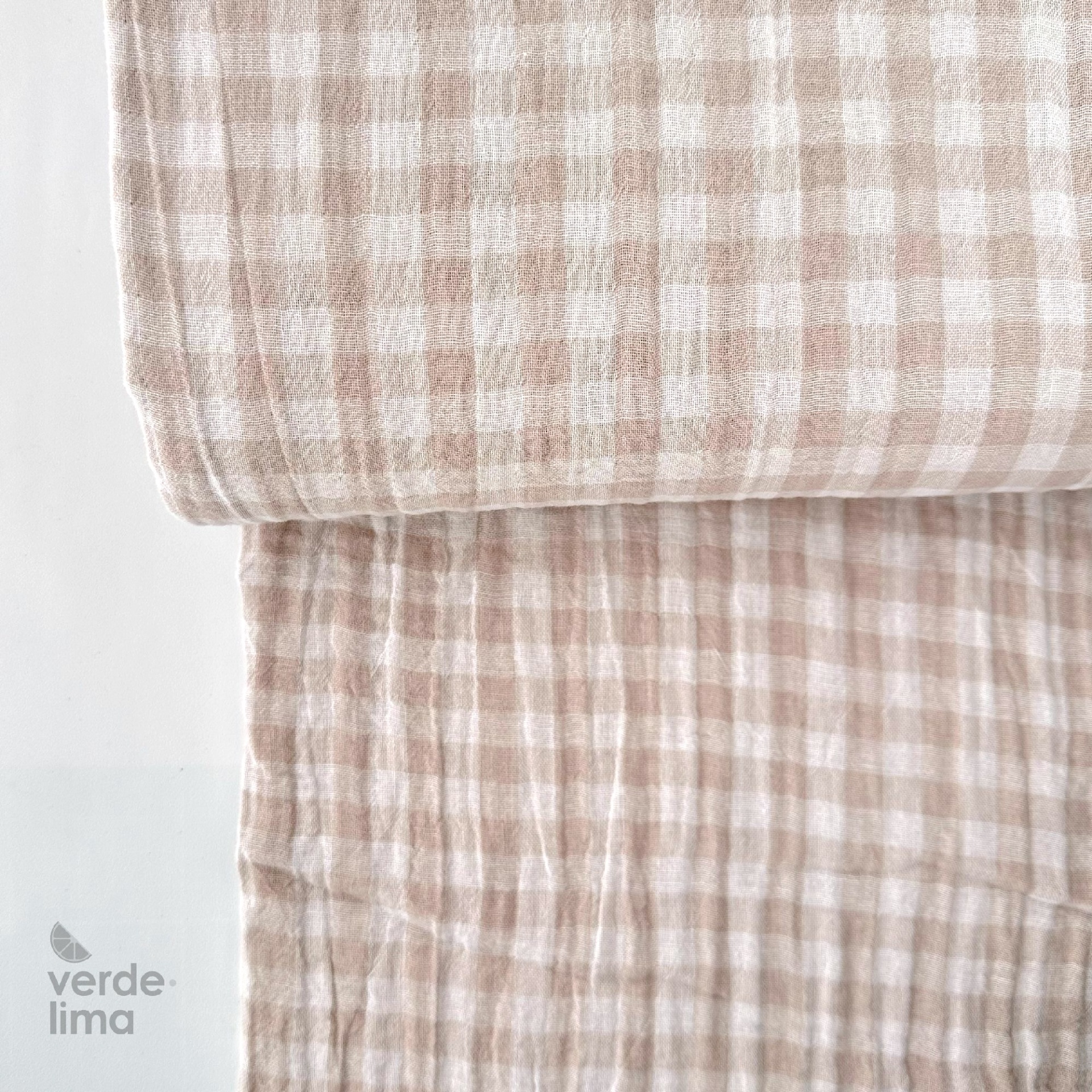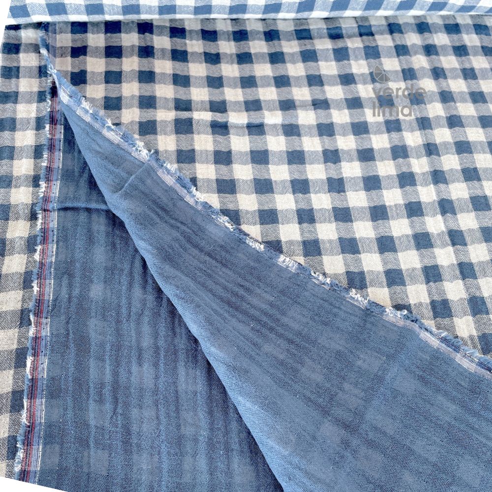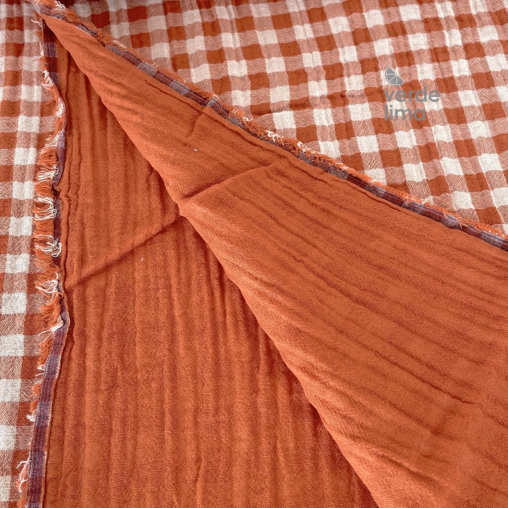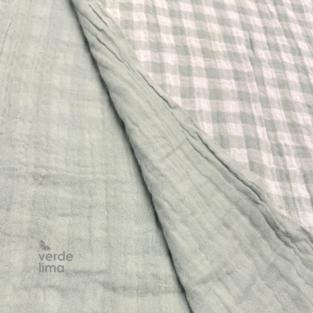 Musselina double gauze com padrão de quadrados numa face e cor lisa na outra face.