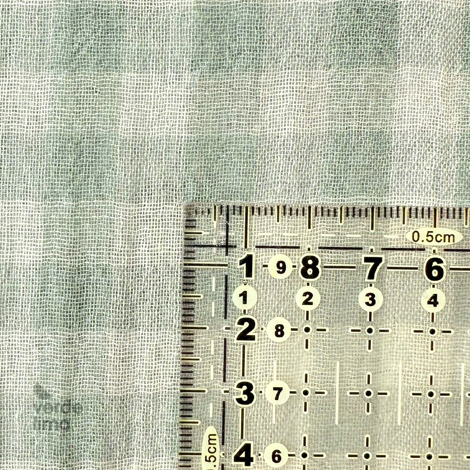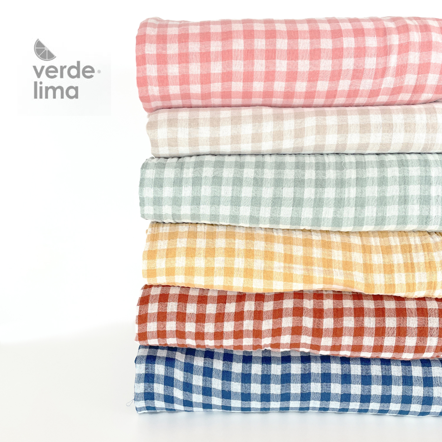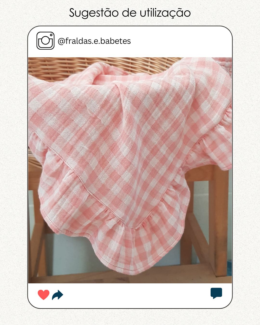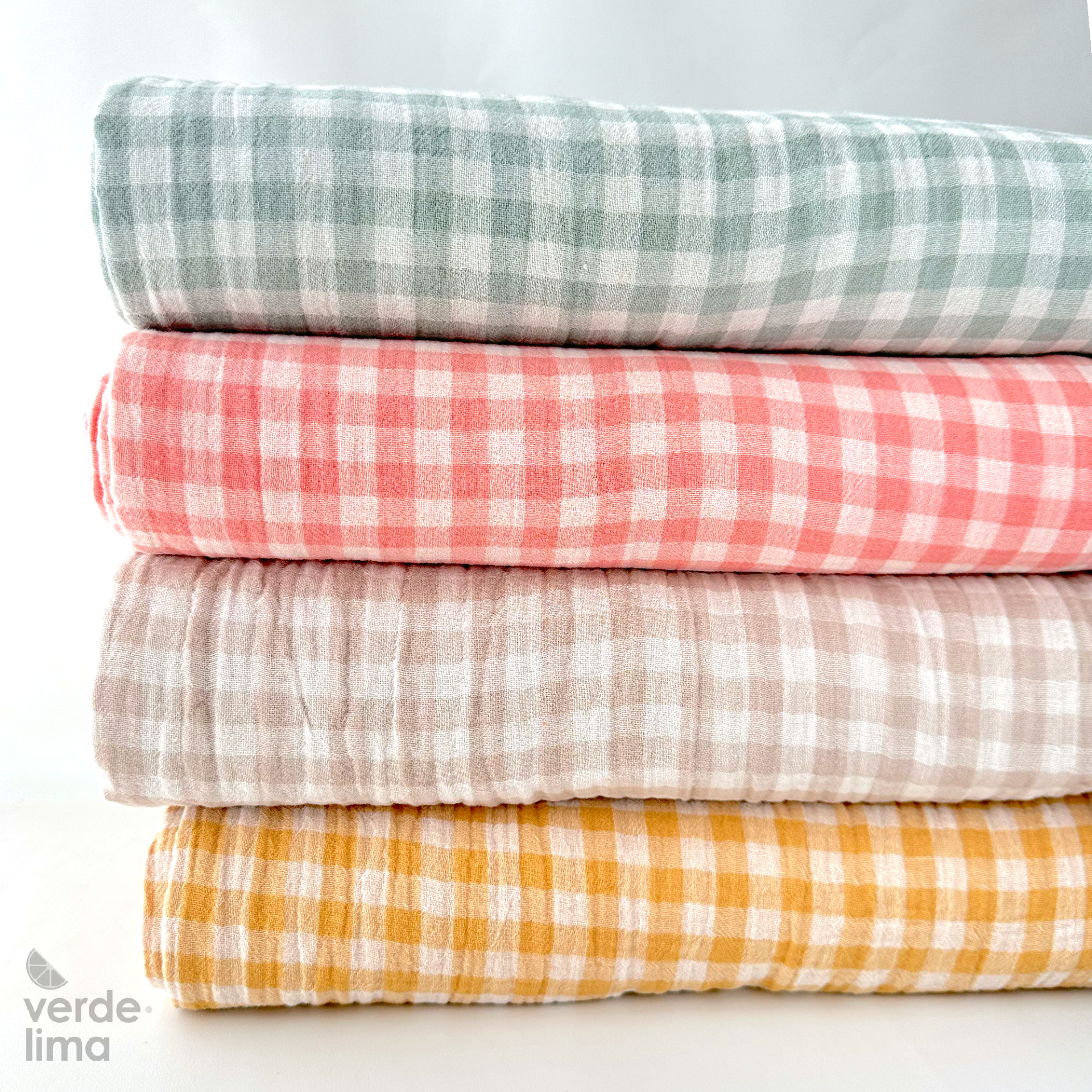 Musselina double gauze com padrão de quadrados numa face e cor lisa na outra face.