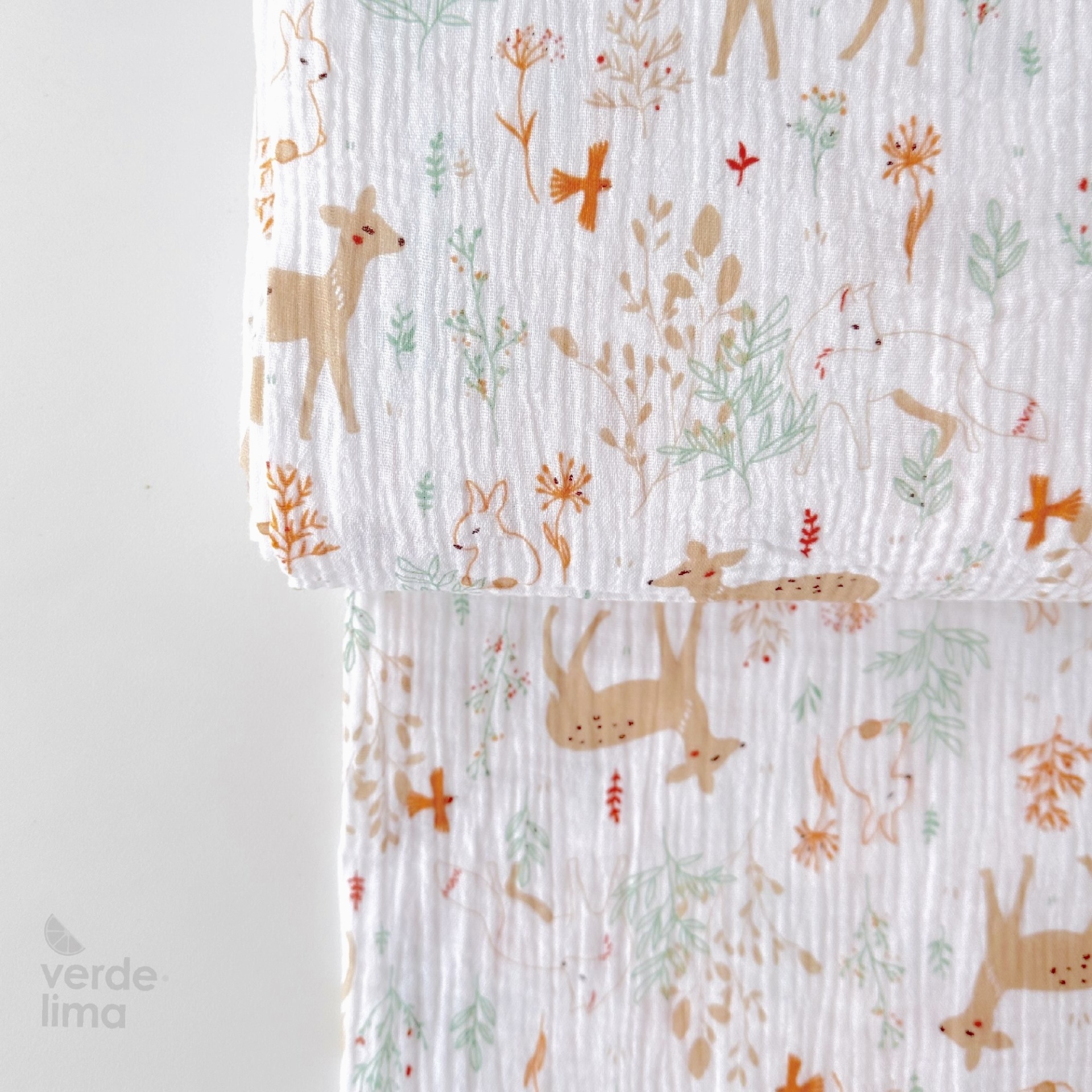 Estampado de animais do bosque em tons de bege, laranja, verde num fundo branco.