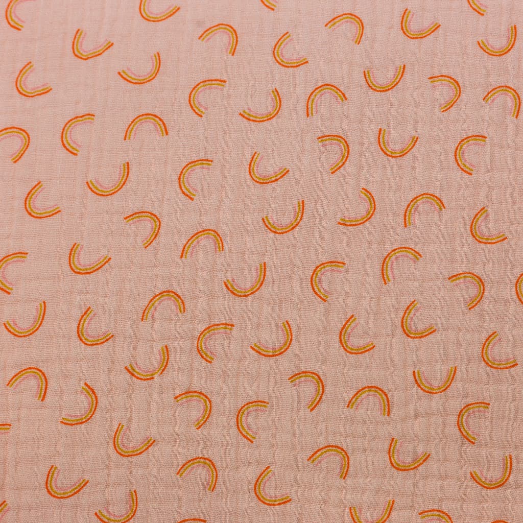 Musselina com pequenos arco-irís em fundo salmão.
