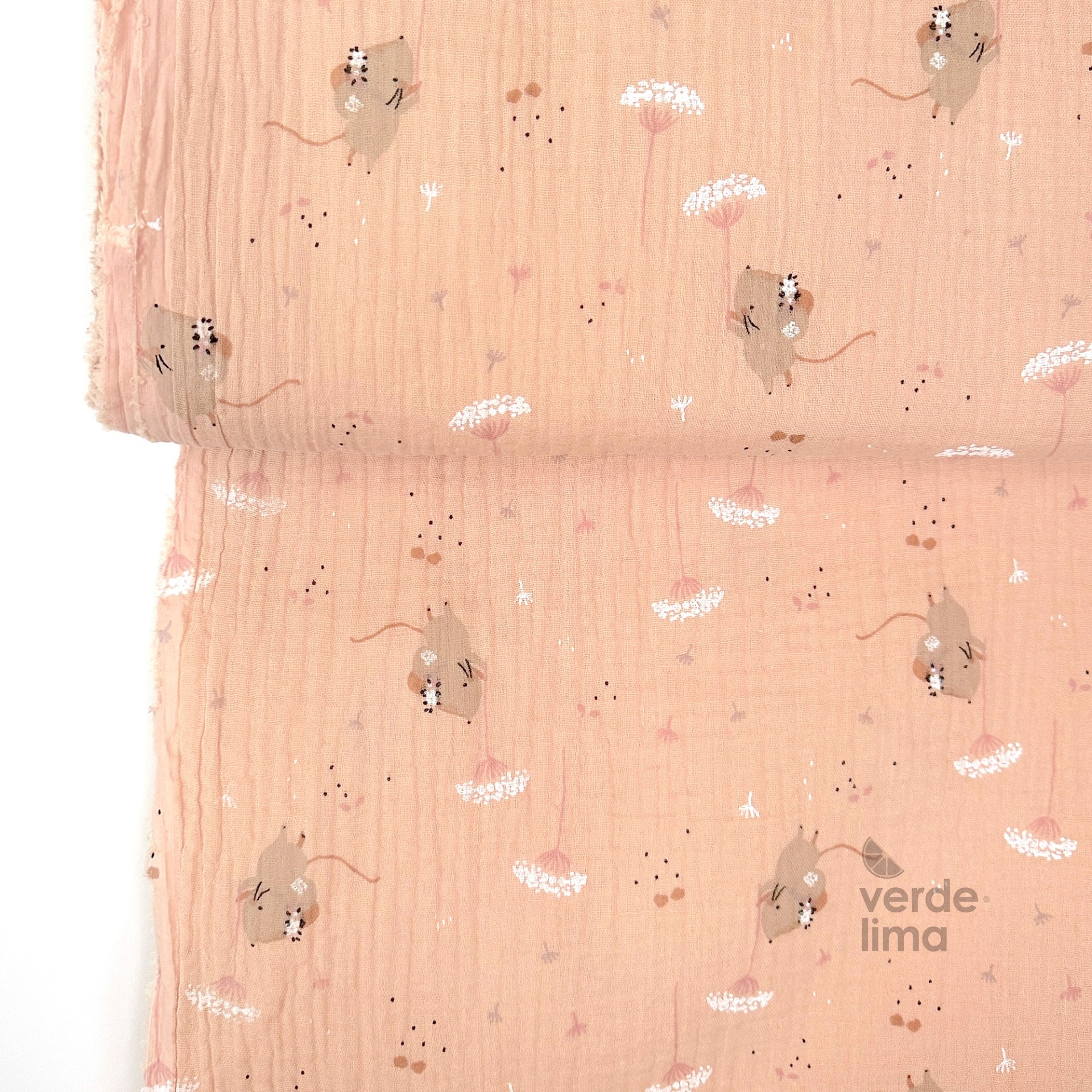 Musselina na cor rosa salmão com estampado de ratinhas e flores.