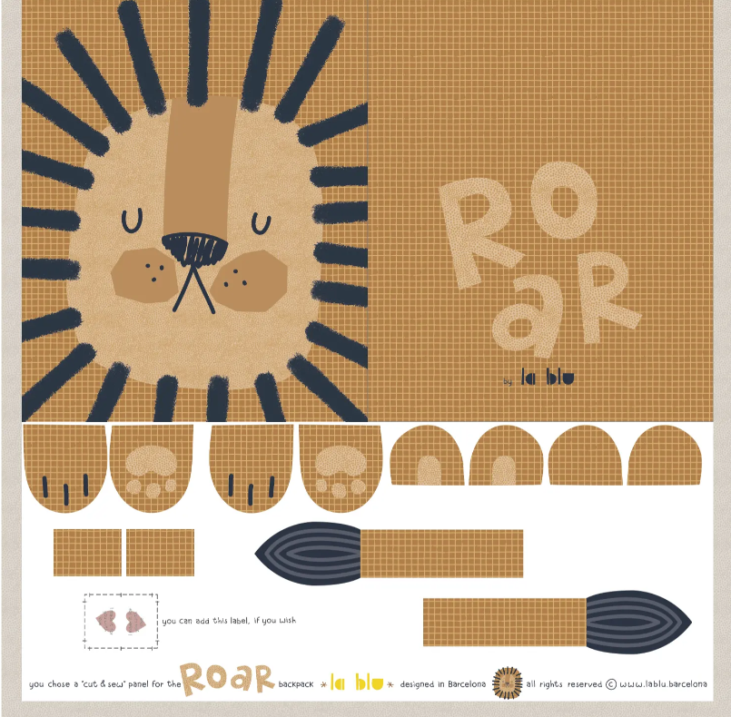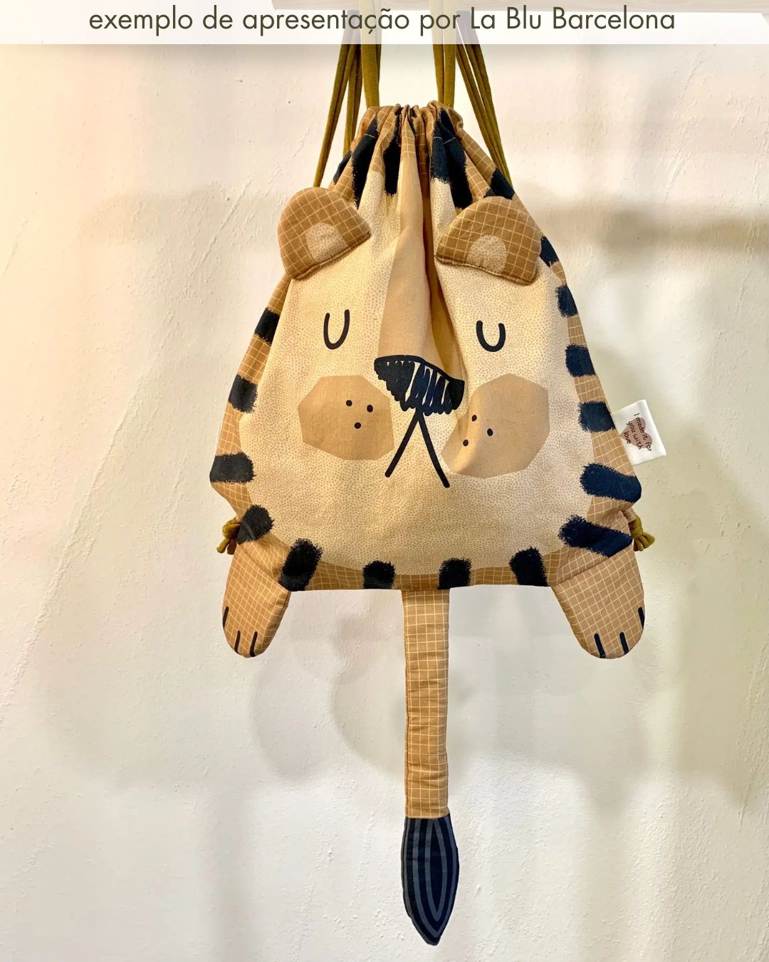 Painel de uma mochila com um leão. Na hora de ir para a escola ou para passear, as mochilas de tecido são ideais para levar os lanches e os brinquedos.