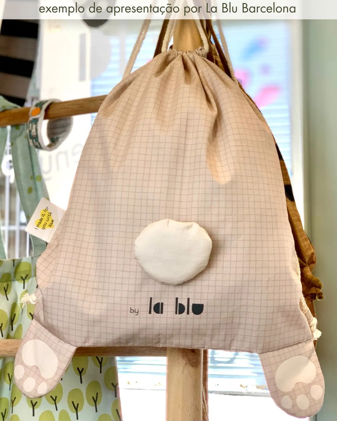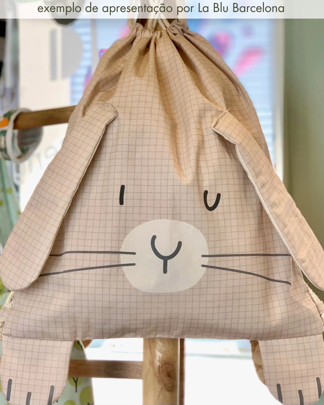 Painel de uma mochila de coelhinho. Na hora de ir para a escola ou para passear, as mochilas de tecido são ideais para levar os lanches e os brinquedos.