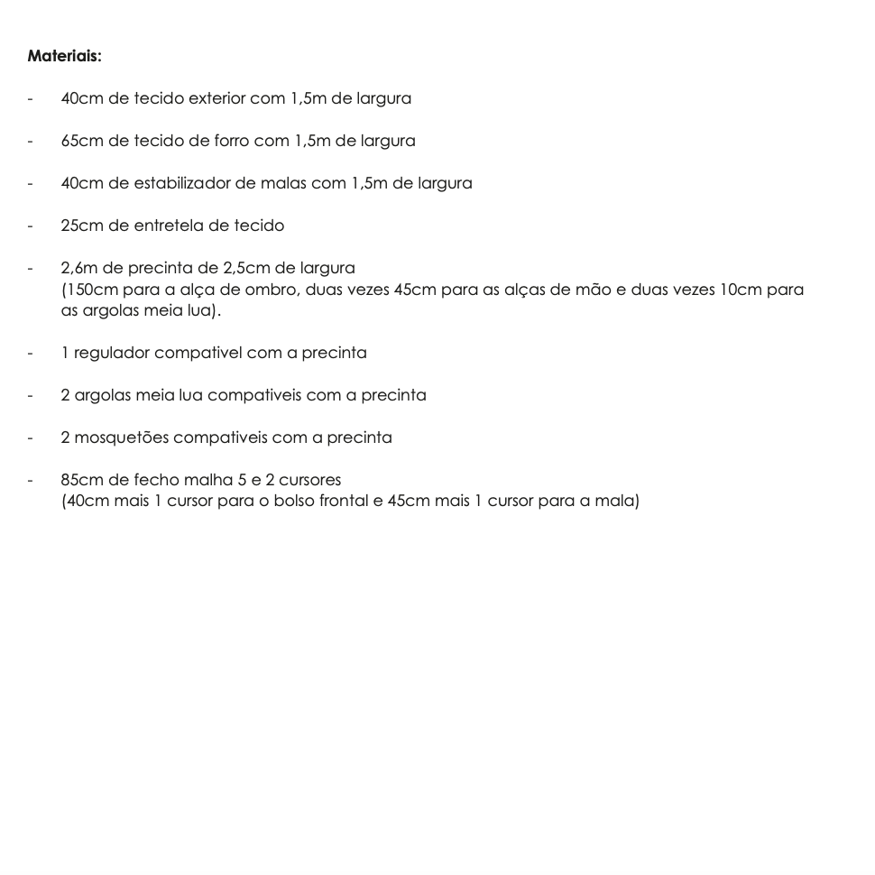 Para seguir este passo a passo necessita de ter algumas bases de costura, máquina de costura, linha, alfinetes, molas mágicas, caneta de marcar tecido, alicate de molas de plástico, cola de tecidos, régua e os seguintes materiais: