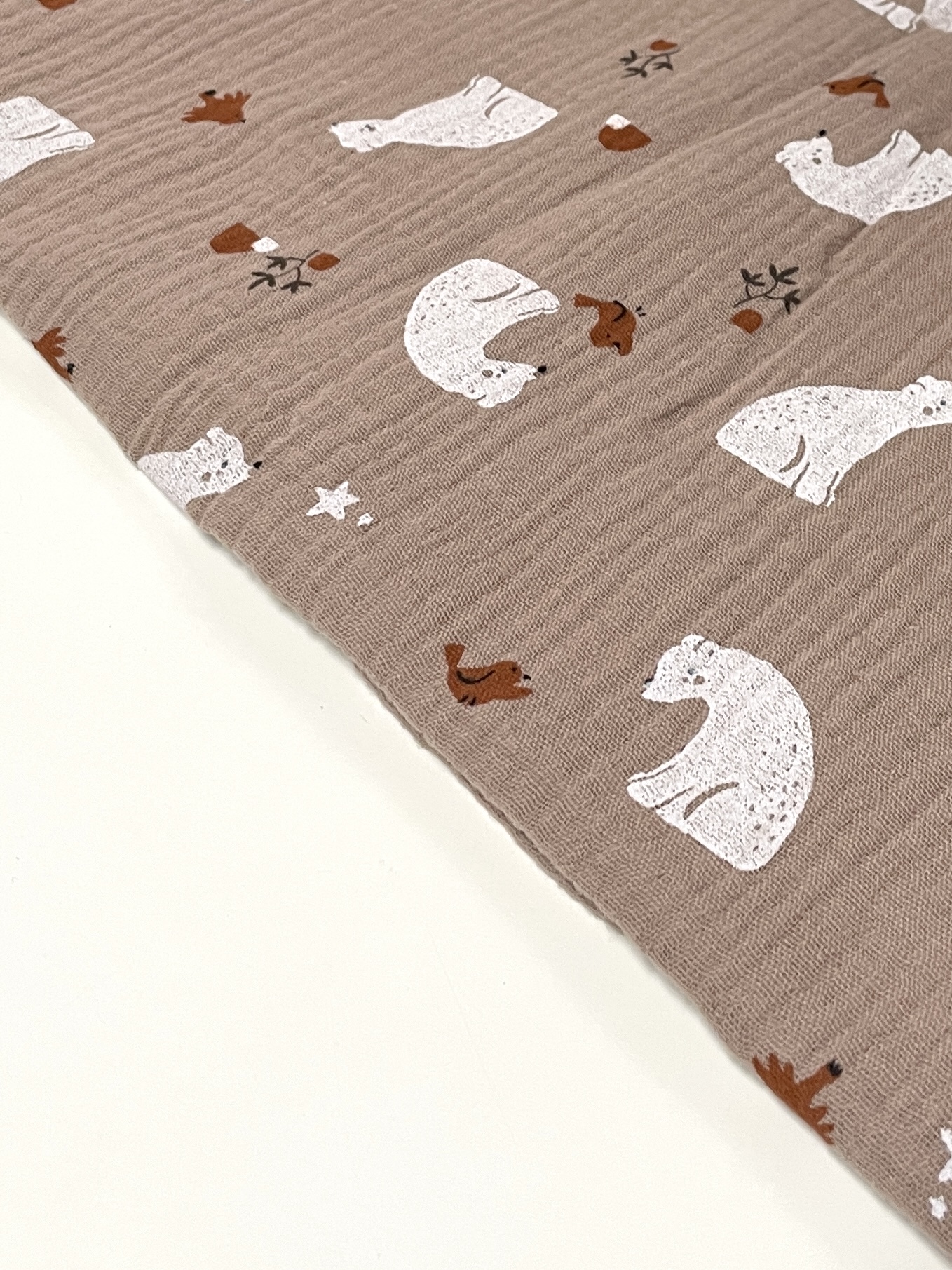 Musselina na cor taupe com estampado de ursos polares, pássaros, folhas e estrelas.