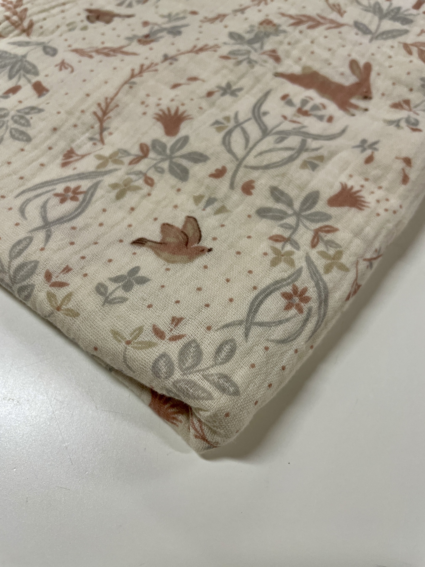Musselina na cor bege com estampado de coelhos e passarinhos num arabesco floral.
