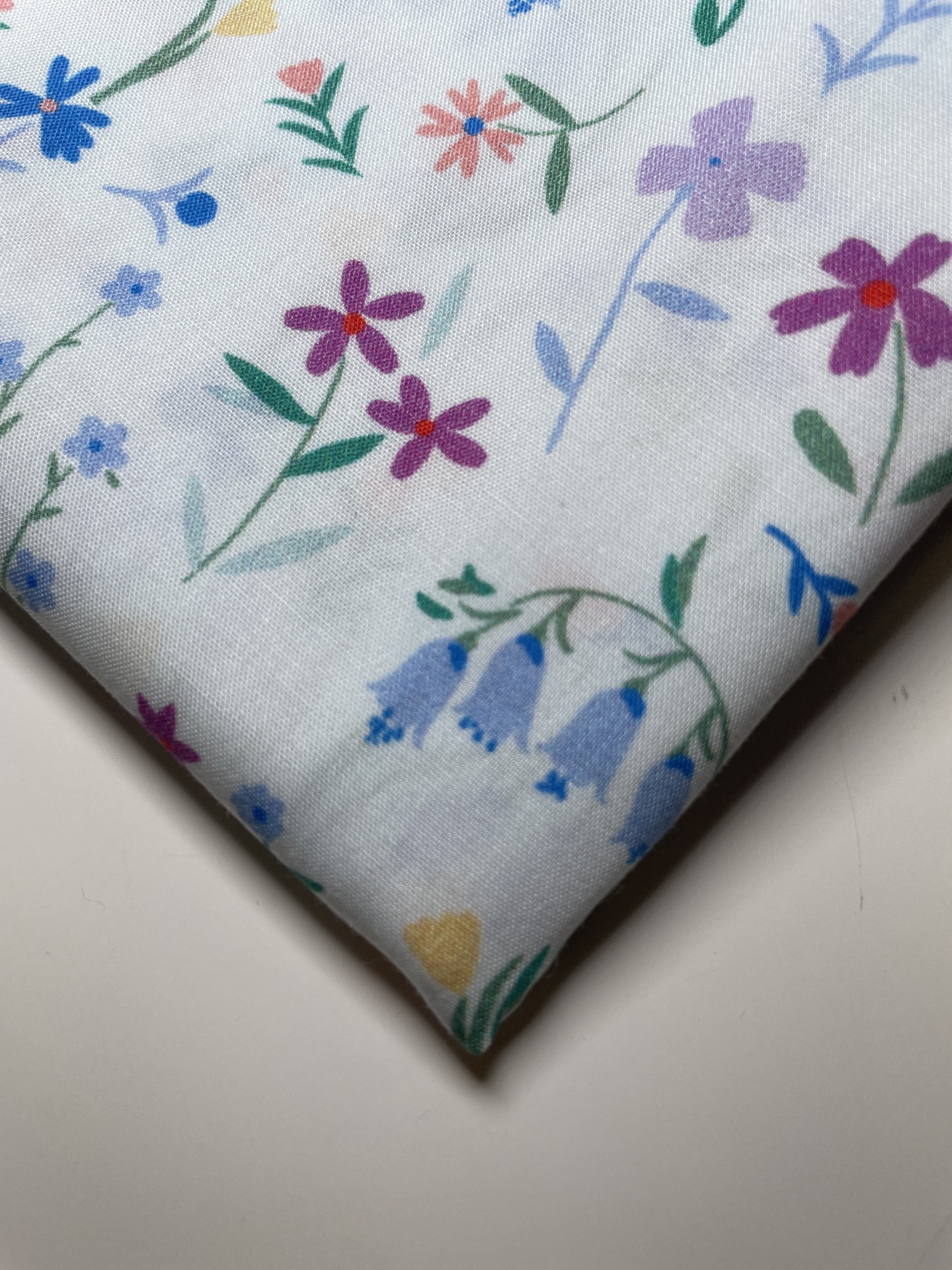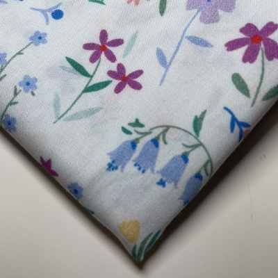 Tecido de popelina com estampado floral em tons de azul, rosa e lilás sobre um fundo branco azulado.