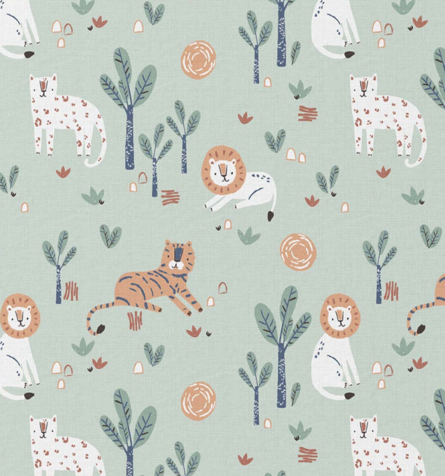 Estampado de leões e tigres na selva num fundo azul.