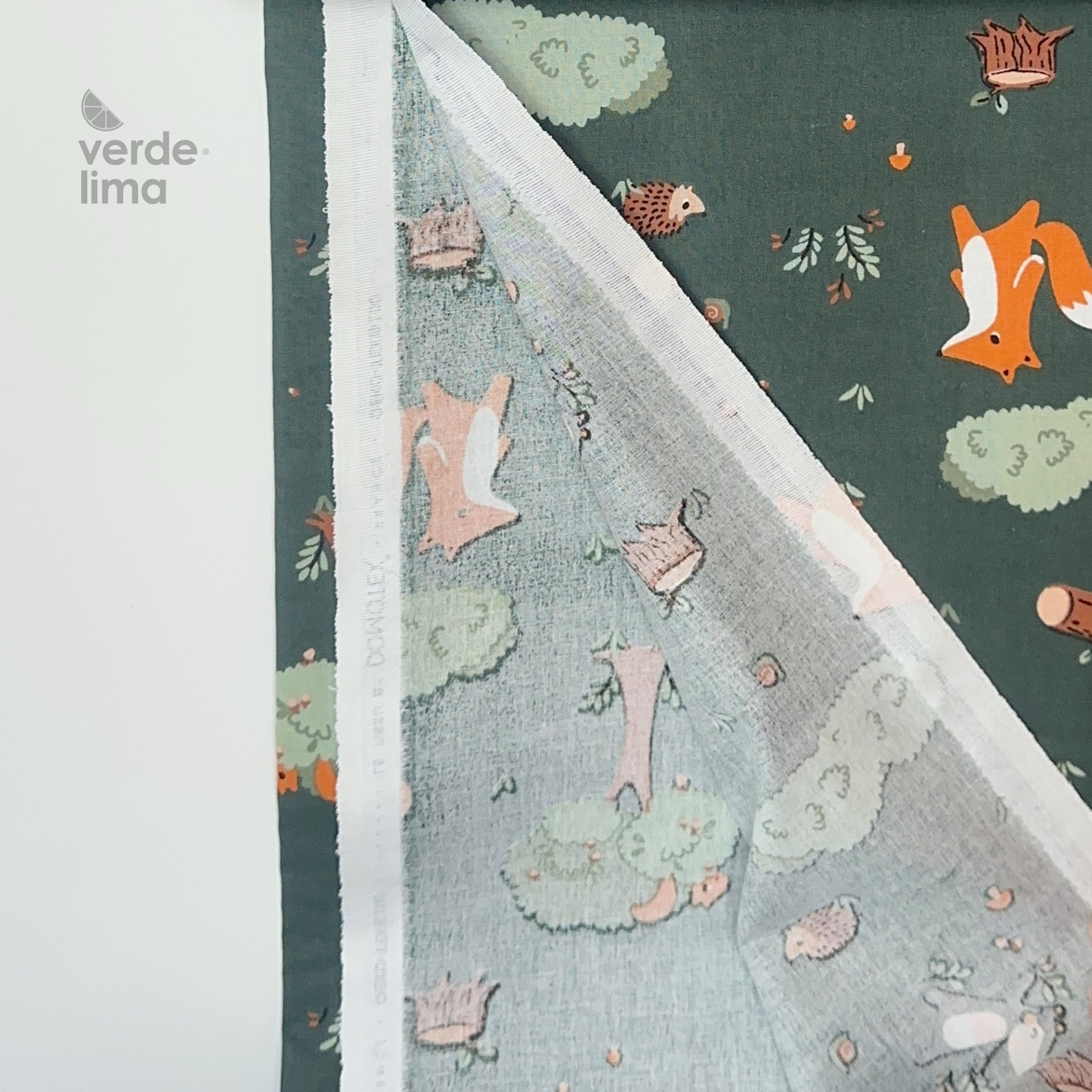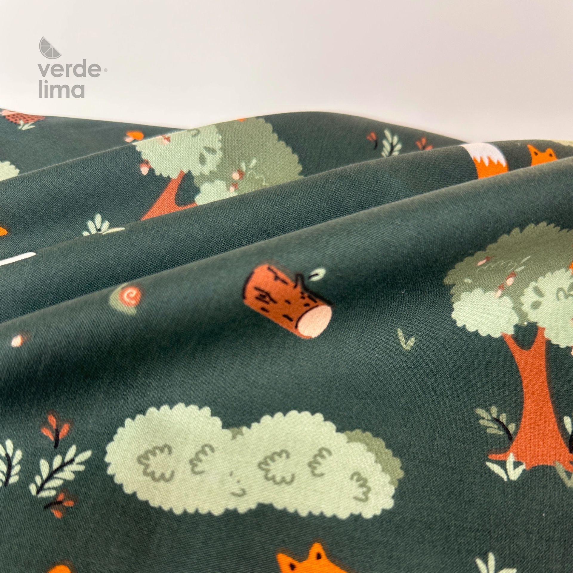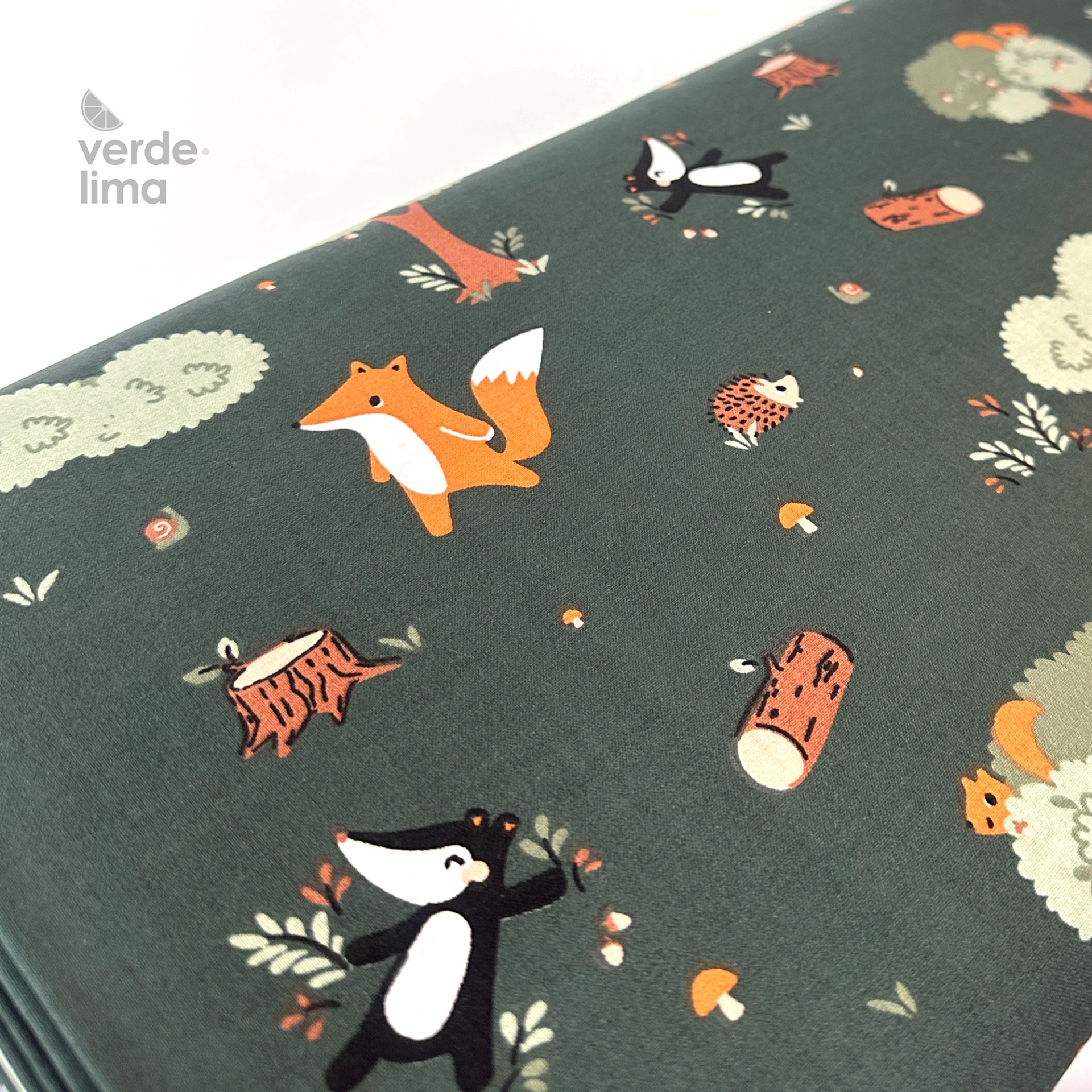 Estampado de animais do bosque num fundo verde escuro.