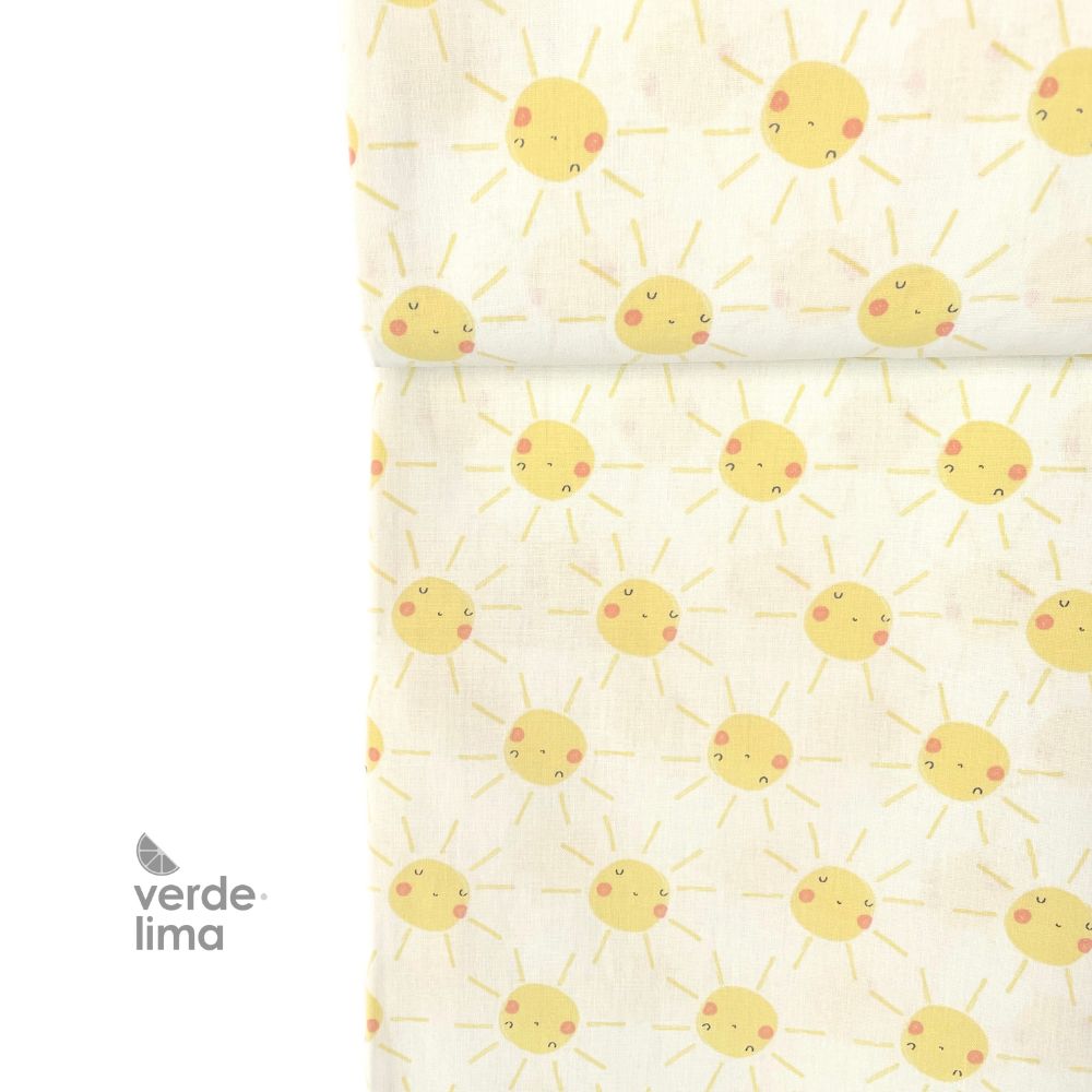 Estampado de sóis sorridentes num fundo creme.