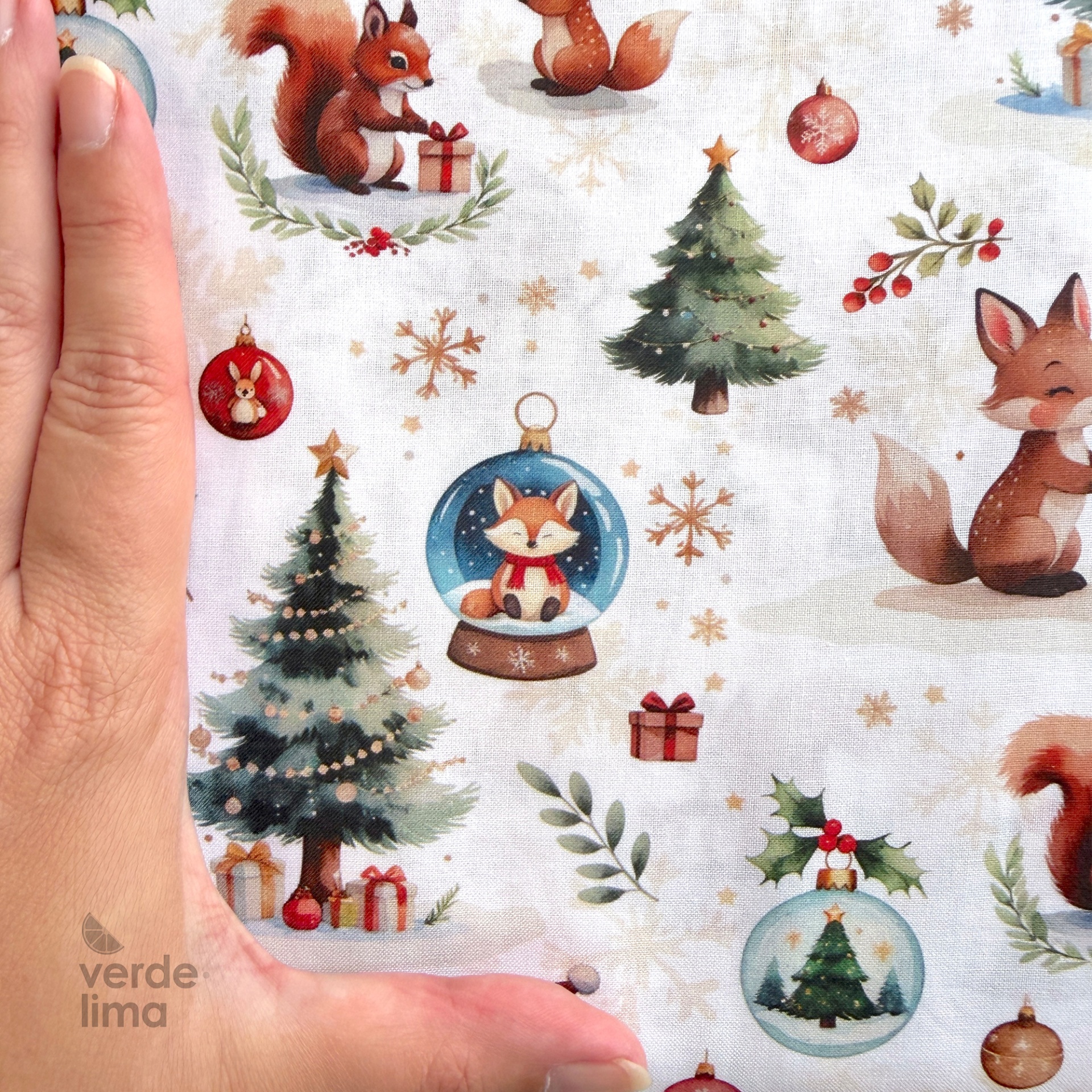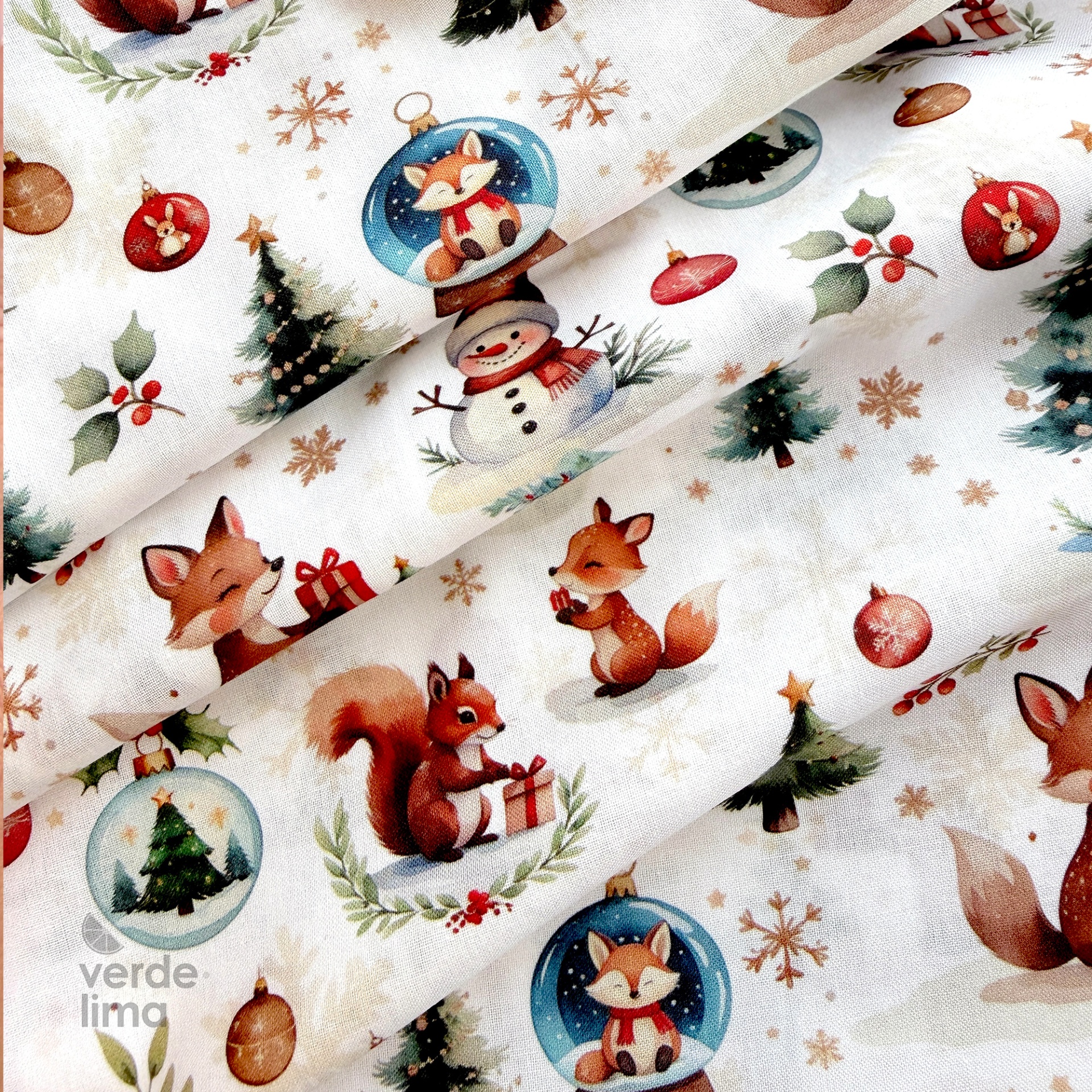Estampado digital de raposas, esquilos, bonecos de neve, pinheiros de natal e outros elementos em fundo branco.