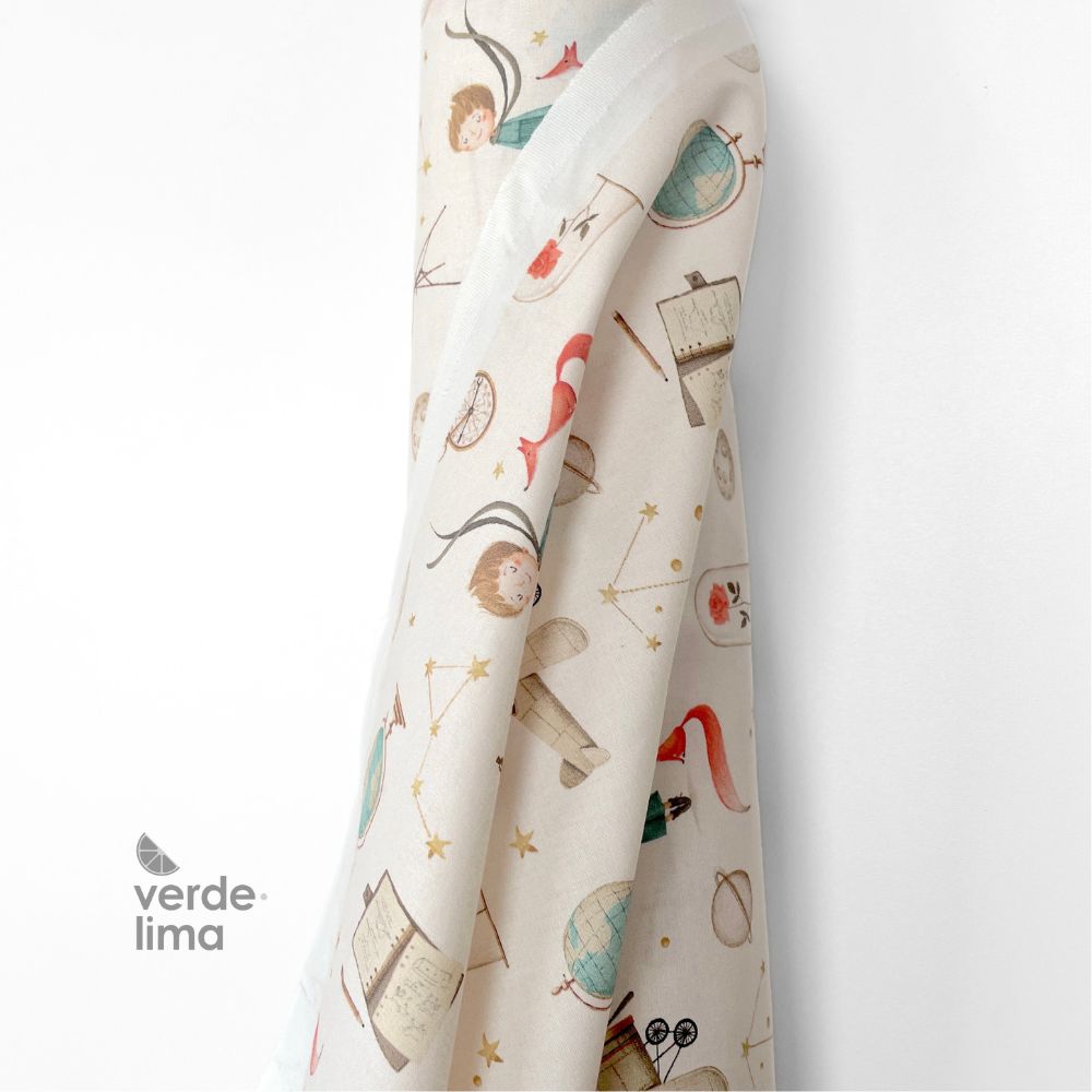 Tecido estampado digital efeito aguarela com motivos do principezinho num fundo bege muito clarinho.