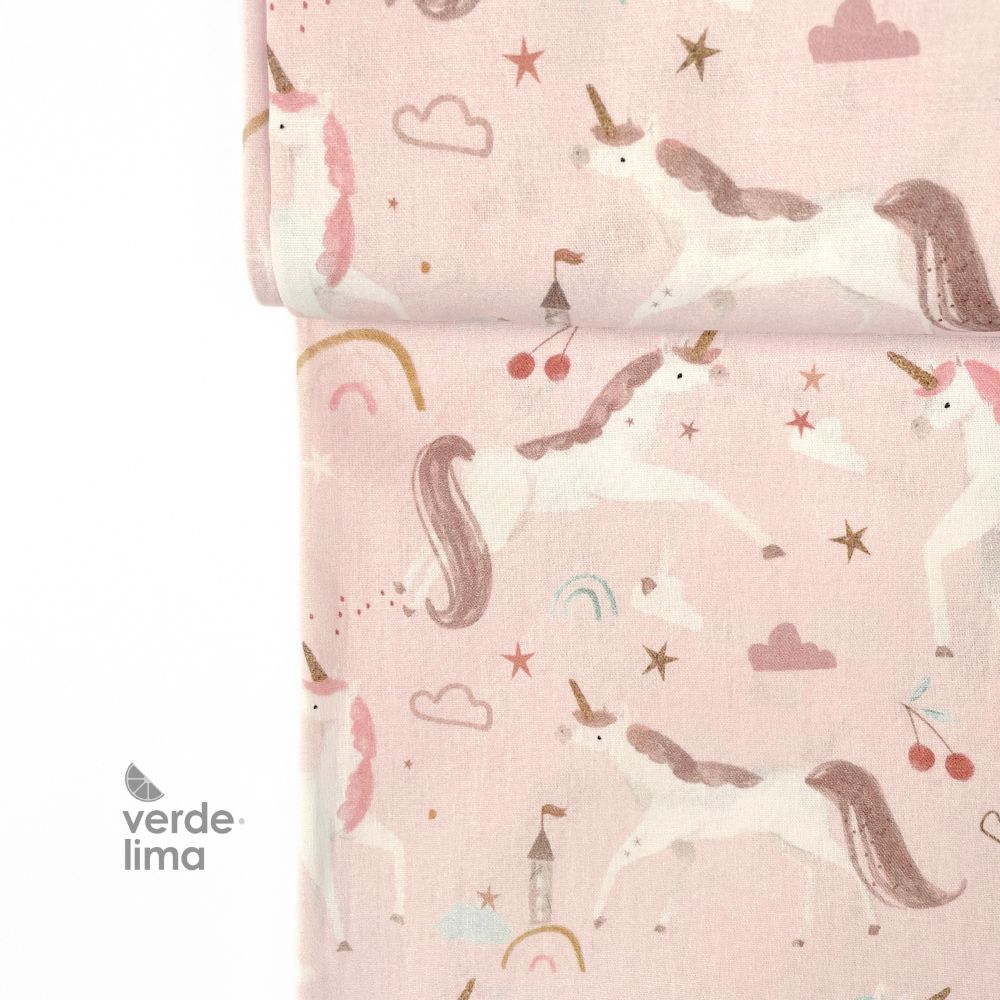 Estampado digital com unicórnios com arco-íris e estrelas num fundo rosa.