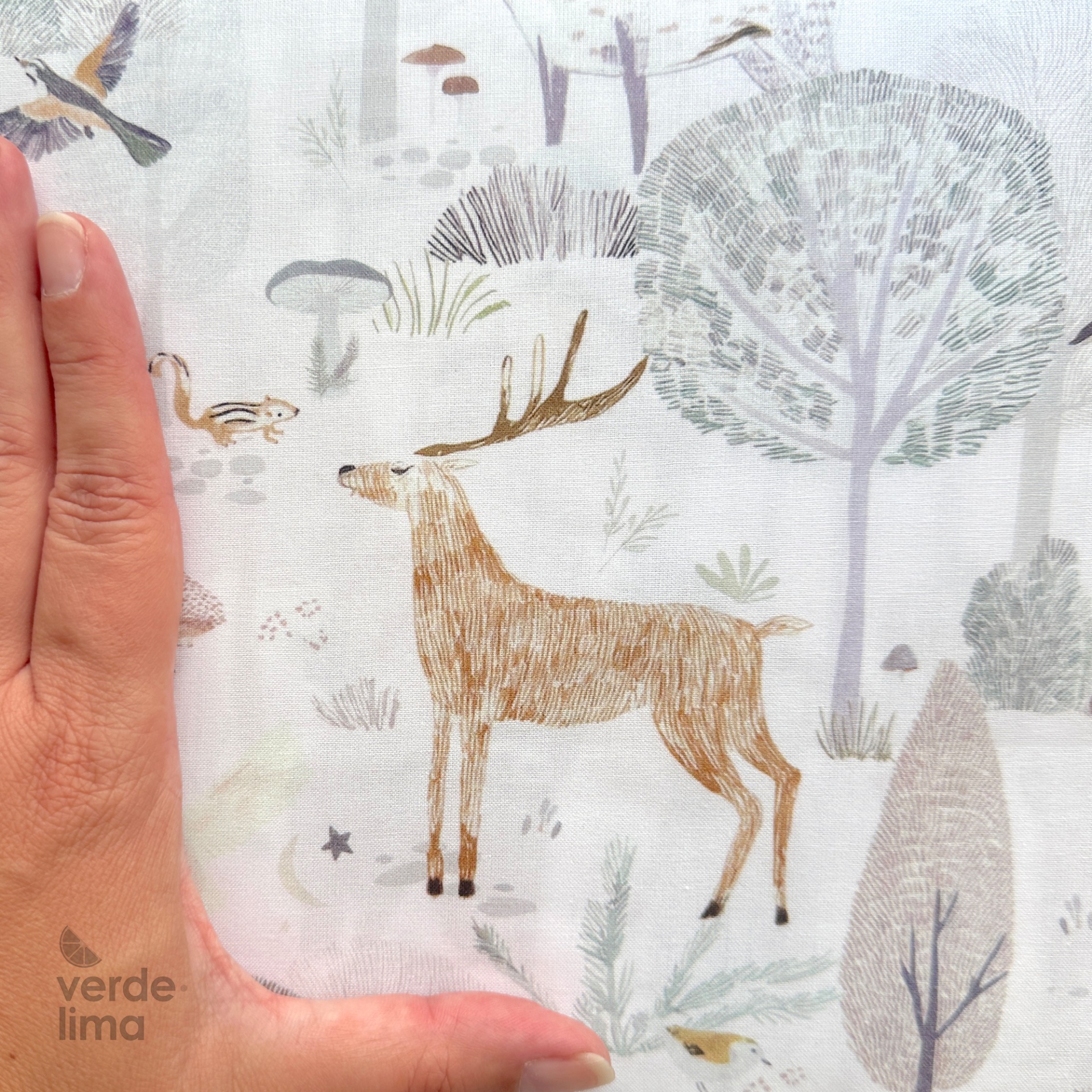 Estampado digital de animais da floresta e árvores num fundo branco.