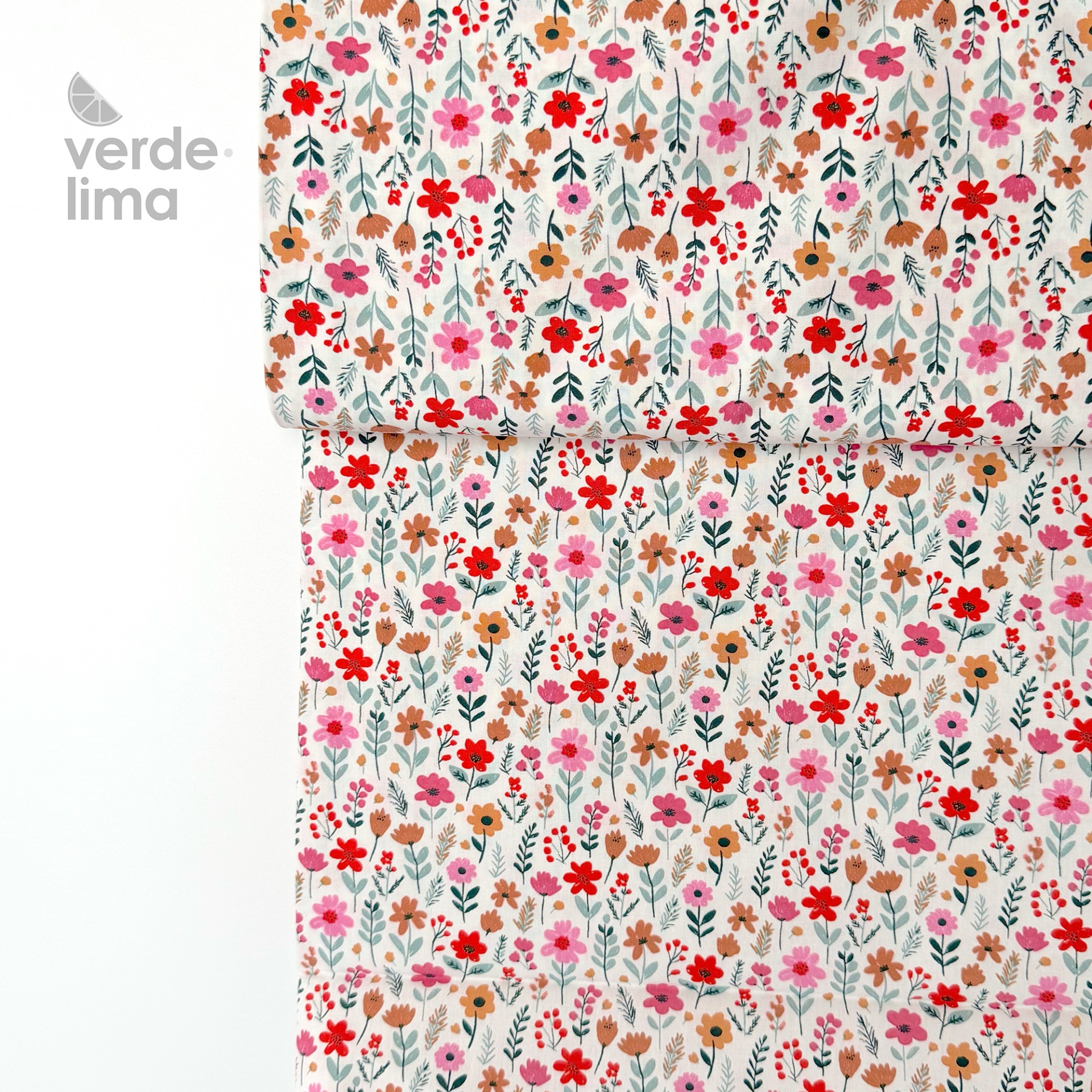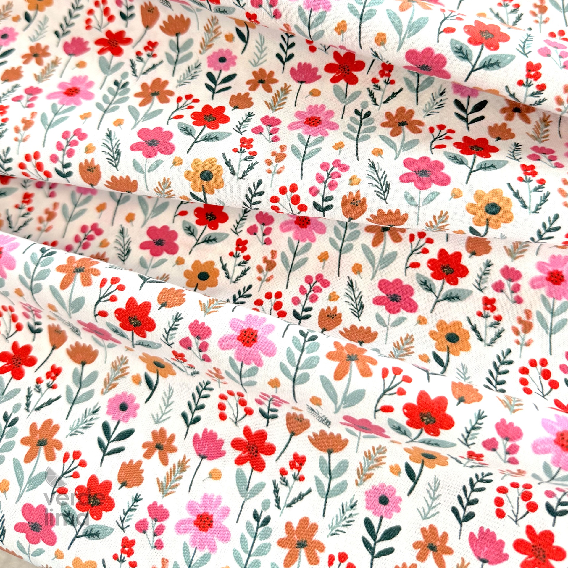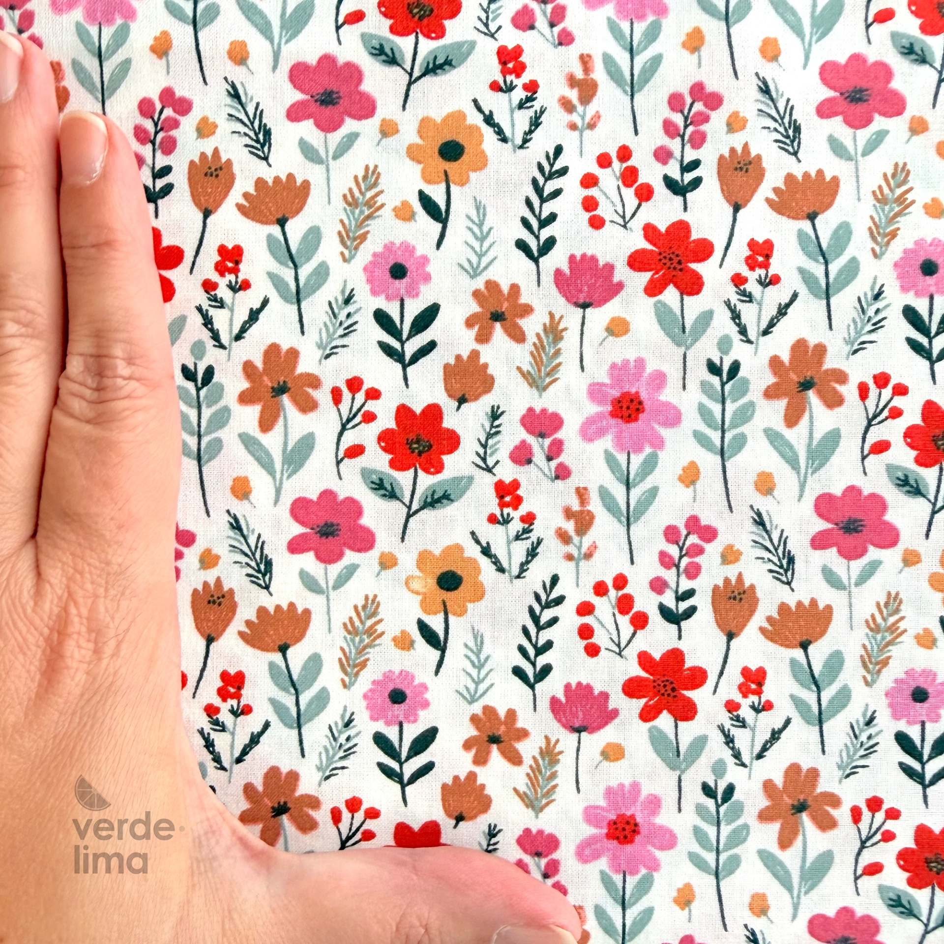 Estampado de flores em tons de vermelho, rosa forte, camel, verde escuro e menta escuro num fundo branco.