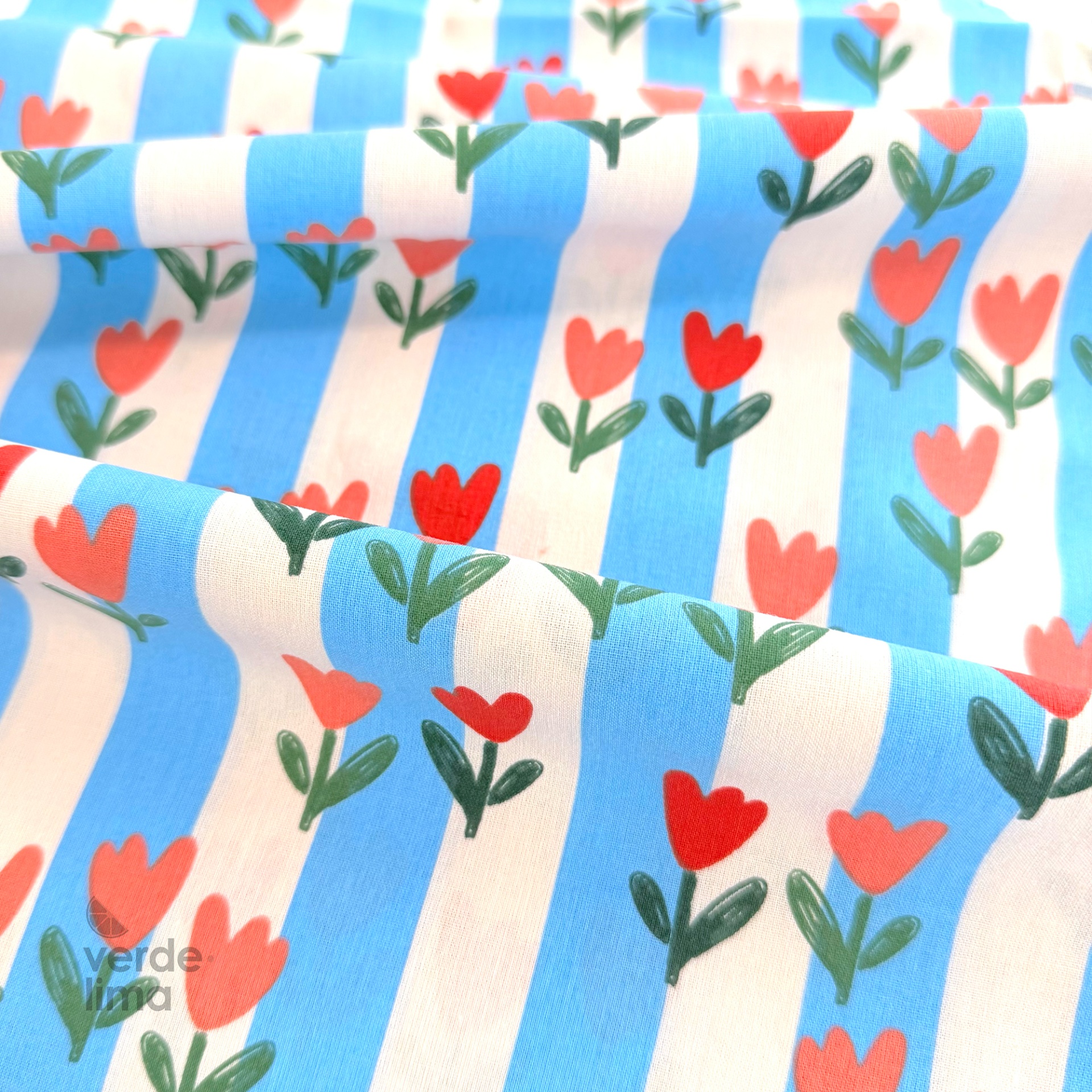 Tecido de Algodão - Riscas azuis e tulipas