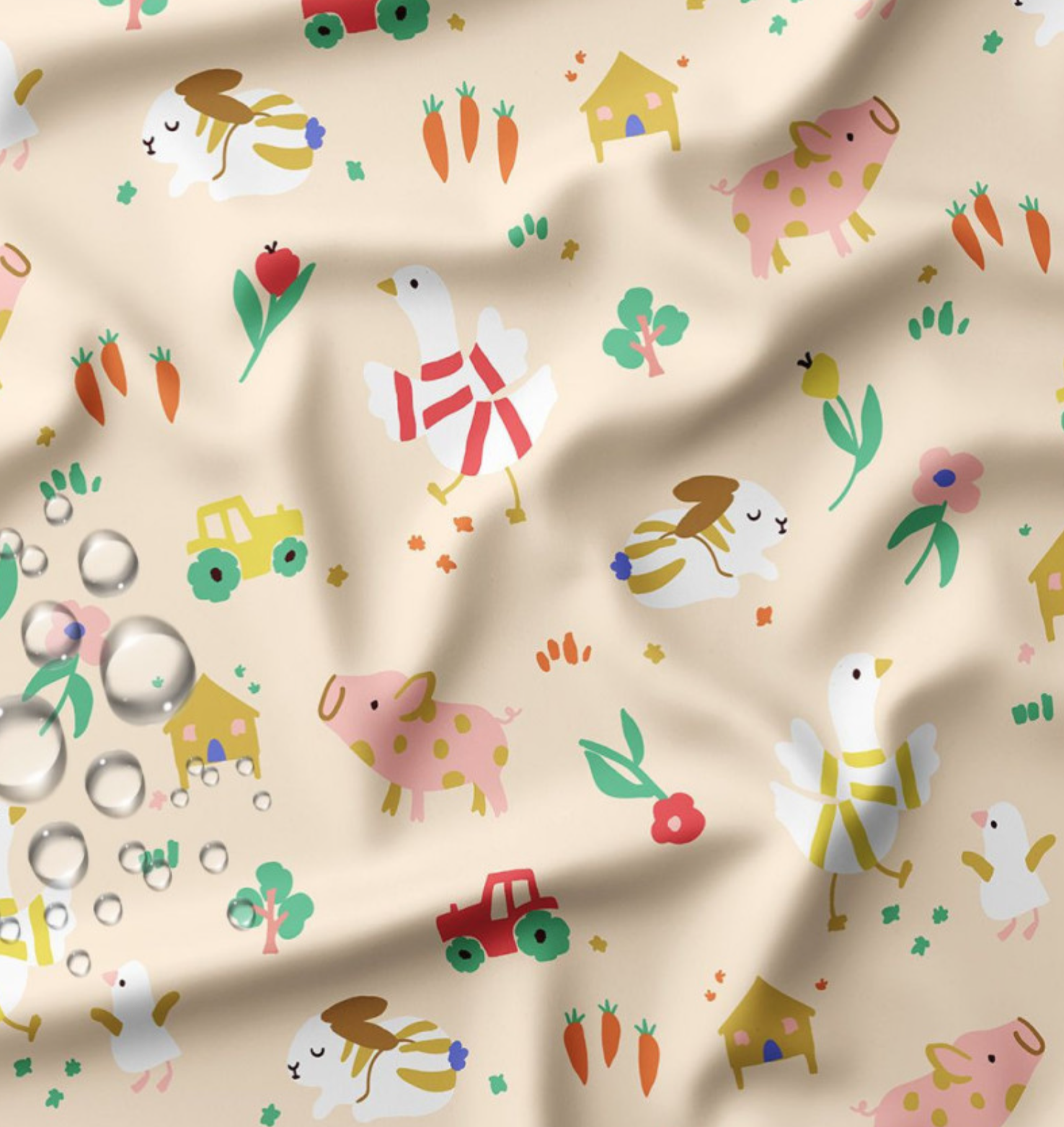 Tecido impermeável, super leve e macio, com um estampado de animais da quinta em fundo bege.