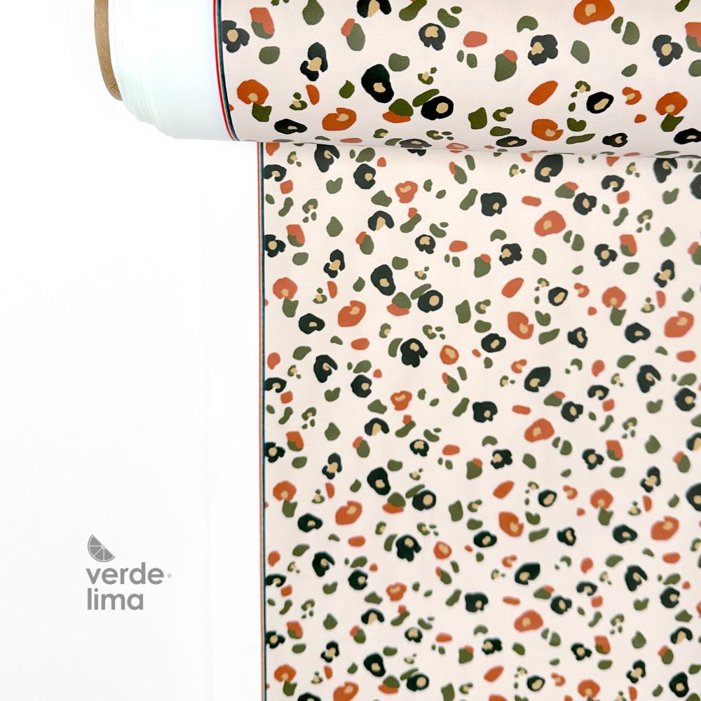 Tecido impermeável, super leve e macio, com um estampado de animal print em tons de bege e verdes.
