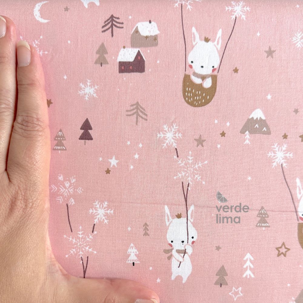Estampado de coelhos, casas, montanhas, árvores e flocos de neve num fundo rosa.